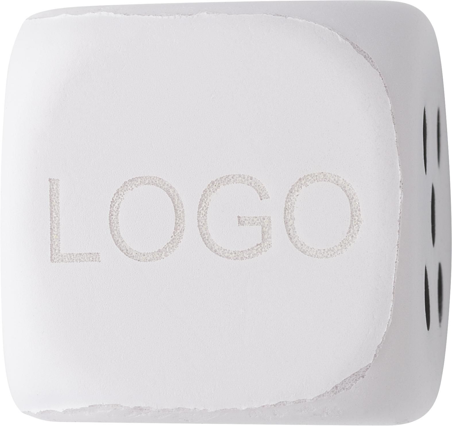 Antistress a forma dado, personalizzabile su di un lato, in PU. Gli articoli antistress possono essere stampati solo nei colori nero, bianco, oro o argento.