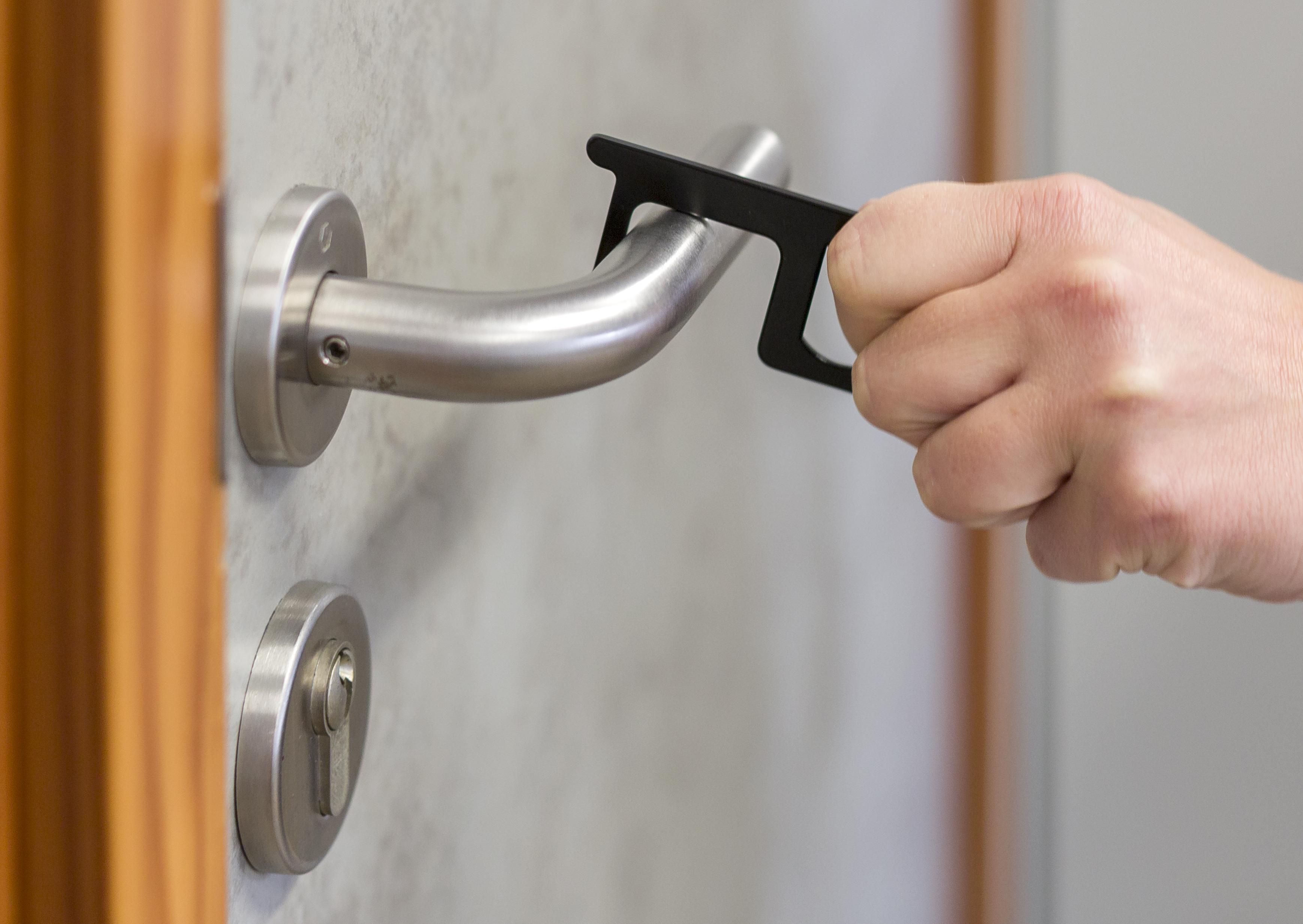 Apriporta in alluminio con funzione apribottiglie, utilizzabile per aprire le porte oppure premere i pulsanti in pubblico senza doverli toccare