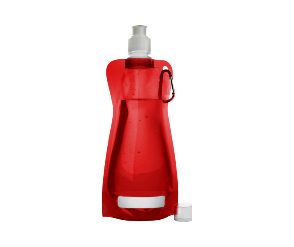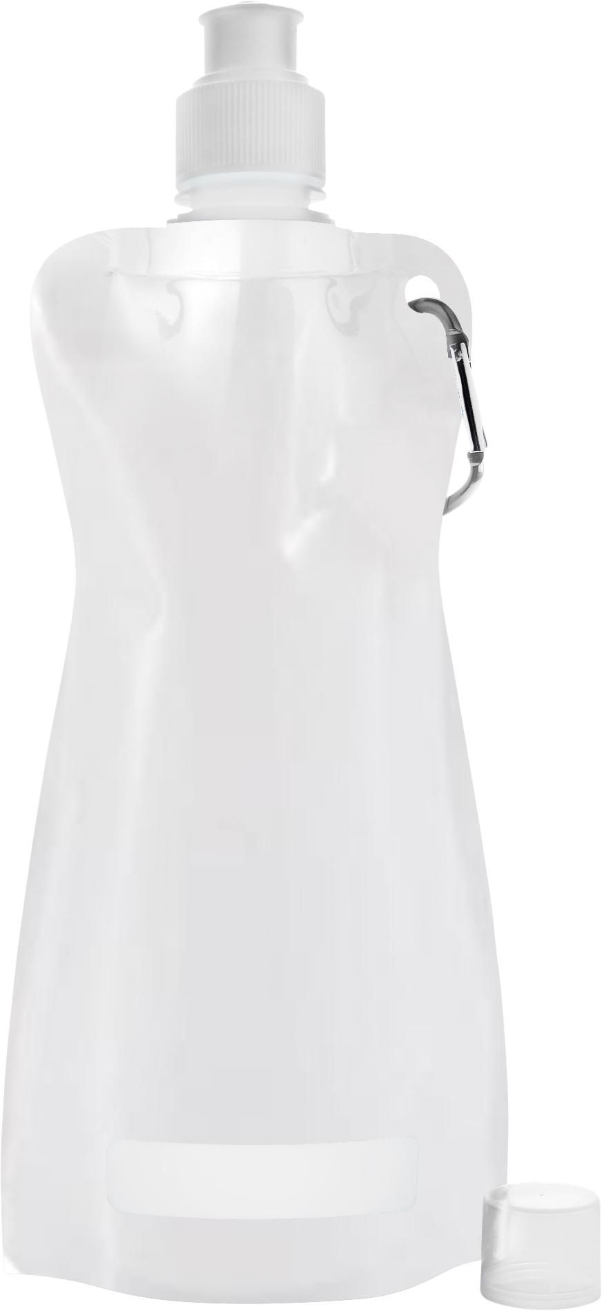 Borraccia pieghevole con moschettone, in PP, tappo con chiusura a tiraggio, si utilizza premendola senza doverla appoggiare alla bocca, capacità 420 ml