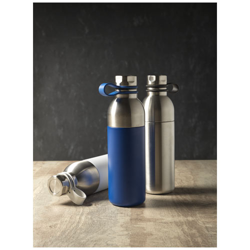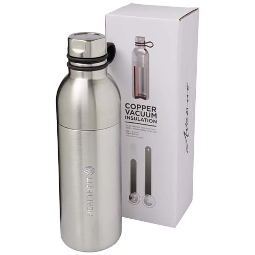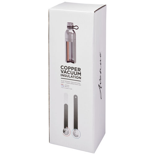Struttura sottovuoto in acciaio inossidabile a doppia parete con isolamento in rame che permette alla bevanda di rimanere fredda per 48 ore o calda per almeno 12 ore. La costruzione impedisce anche la formazione di condensa all'esterno della borraccia. Dotata di un coperchio avvitabile in acciaio inossidabile con un comodo anello in silicone. Struttura a doppia apertura per una facile pulizia e riempimento. Capacità di 590ml. Presentata in una confezione regalo Avenue.