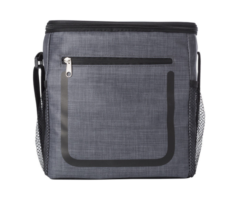 Borsa termica, con tasca anteriore con zip e scomparti retati sull'altro lato, interno rivestito con una pellicola refrigerante, tracolla regolabile, in PU