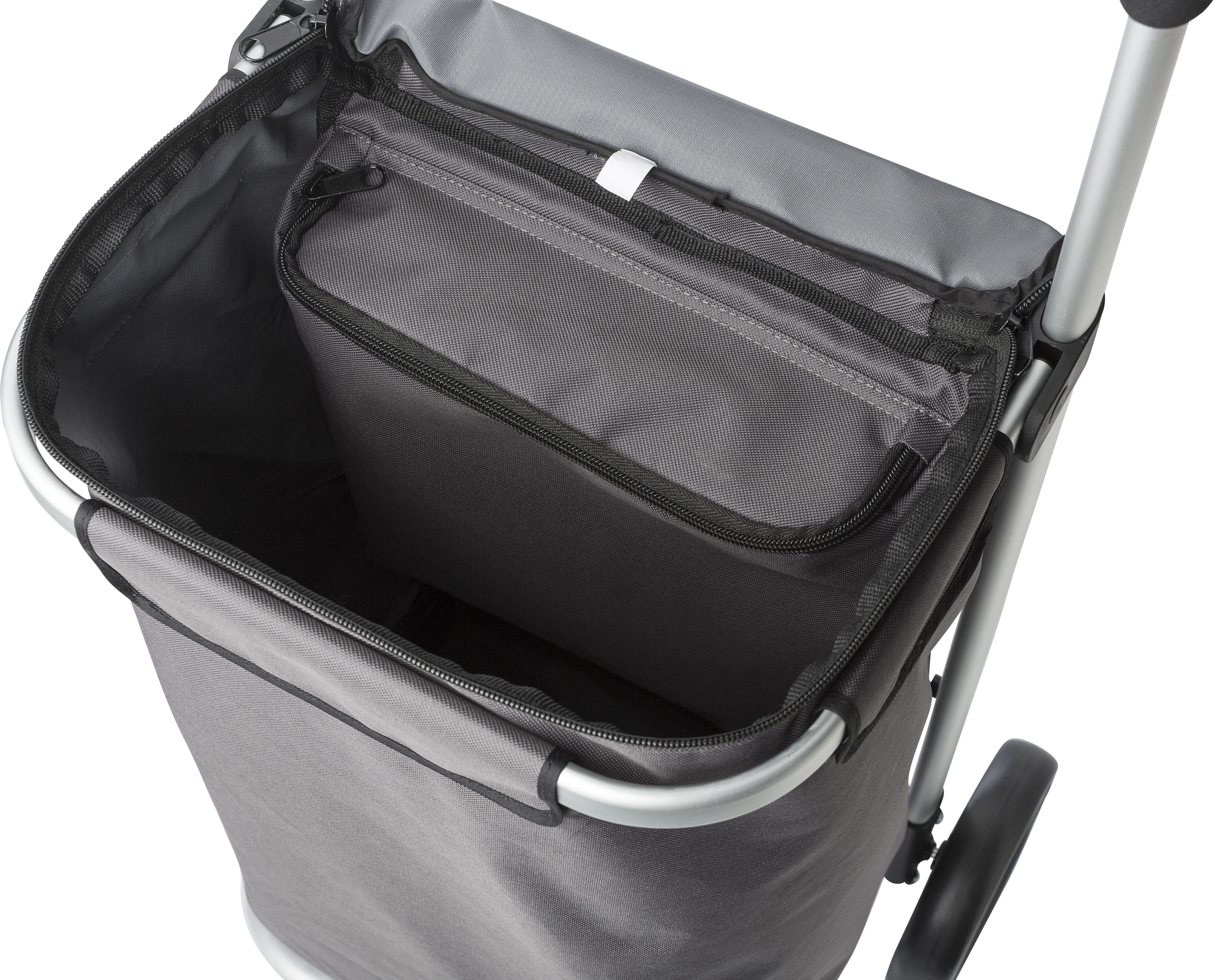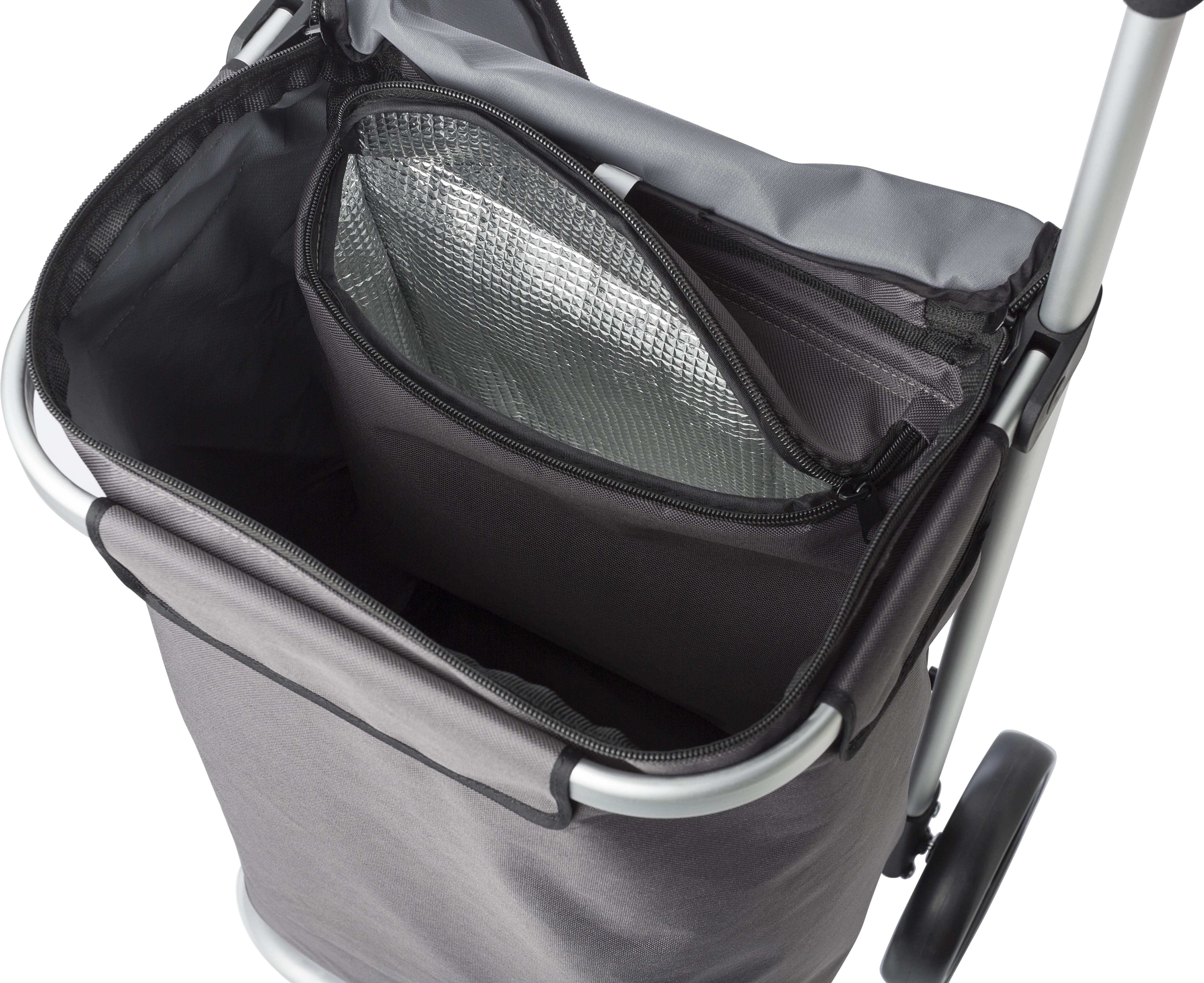 Carrello shopping pieghevole, linea Oxford, scomparto con chiusura lampo, telaio con impugnatura tonda in alluminio e presa in EVA, in poliestere 320-330 gr/m²