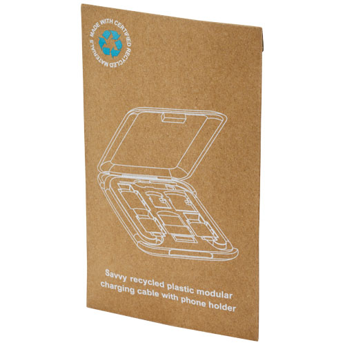 Cavo modulare per il trasferimento dei dati e la ricarica, realizzato in plastica riciclata e fornito all'interno di un'elegante confezione che funge anche da supporto per telefono. Il cavo offre diverse soluzioni di ricarica: ingresso Tipo-C e USB-A e uscita Tipe-C/iOS/micro USB. Grazie a tutti questi adattatori e connettori, questo cavo consente di caricare la maggior parte degli smartphone, delle fotocamere, dei power bank, degli auricolari, ecc. Il cavo ha una potenza massima di uscita di 2 A. Dispone di un pin di espulsione che si rivela utile ogni volta che รจ necessario estrarre la scheda SIM del telefono. Il contenitore presenta anche uno spazio per conservare una scheda di memoria micro SD e una scheda nano SIM, rendendolo un accessorio perfetto per i viaggi. Lunghezza del cavo: 26 cm. Fornito in una busta di carta kraft riciclata al 100%.