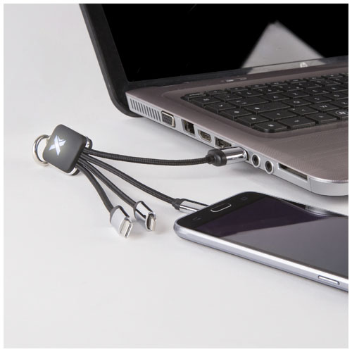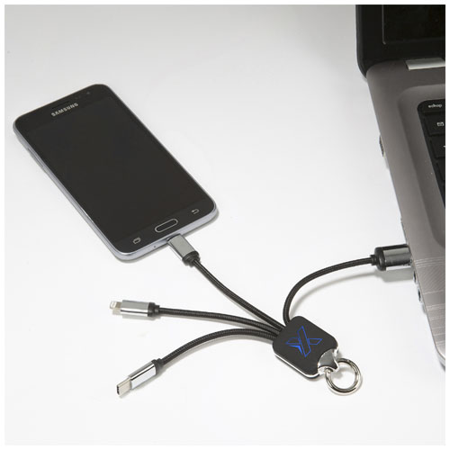 Cavo di ricarica con logo luminoso, finitura in gomma e dotato di tre connettori (tipo C, Android, iPhone). È possibile caricare fino a tre dispositivi contemporaneamente. Lunghezza dei cavi (spine incluse): 10 cm. Cavo in plastica PET riciclata ed'imballaggio realizzato in carta e plastica riciclata.