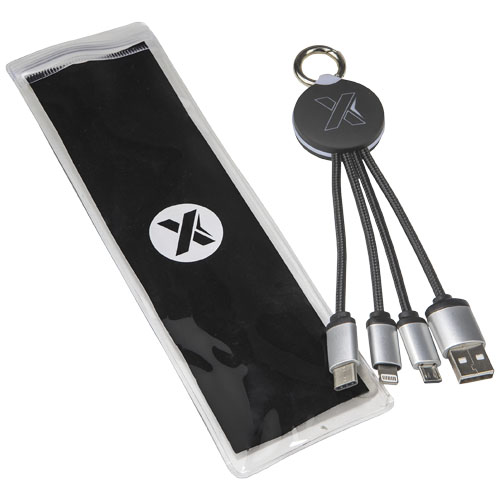 Cavo di ricarica con logo luminoso, finitura in gomma e dotato di tre connettori (tipo C, Android, iPhone). È possibile caricare fino a tre dispositivi contemporaneamente. Lunghezza dei cavi (spine incluse): 10 cm. Cavo in plastica PET riciclata ed'imballaggio realizzato in carta e plastica riciclata.