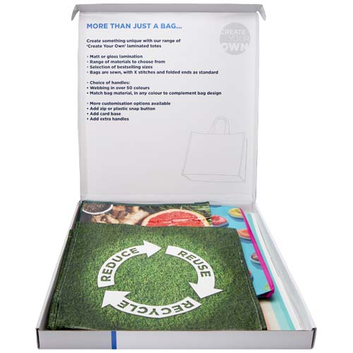 Confezione di tote bag laminate assortite con 4 dimensioni diverse: Tote laminata in tessuto PET riciclato da 140 g/m² (36 x 32 x 12 cm), tote laminata in tessuto non tessuto da 120 g/m² (40 x 45 x 17 cm), tote laminata in tessuto non tessuto da 120 g/m² (40 x 35 x 20 cm) e tote laminata in tessuto da 140 g/m² (42 x 32 x 16 cm).