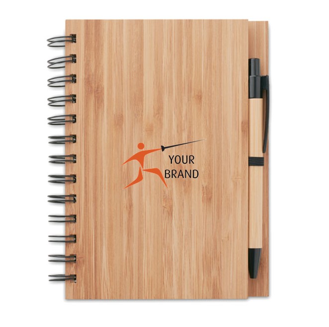 Notebook with bamboo cover, 70 pages in recycled paper. Includes pen with bamboo body, ABS tip and clip.