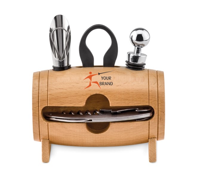 Barrel-shaped wine set consisting of: knife, stopper, drip stopper and foil cutter. Wood.