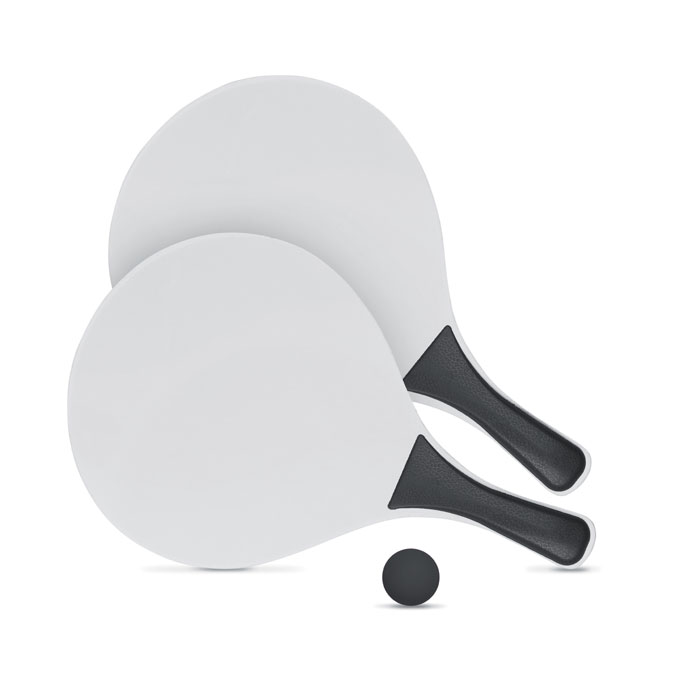 Sea tennis set consisting of 2 medium density recomposed wooden rackets and 1 rubber ball.