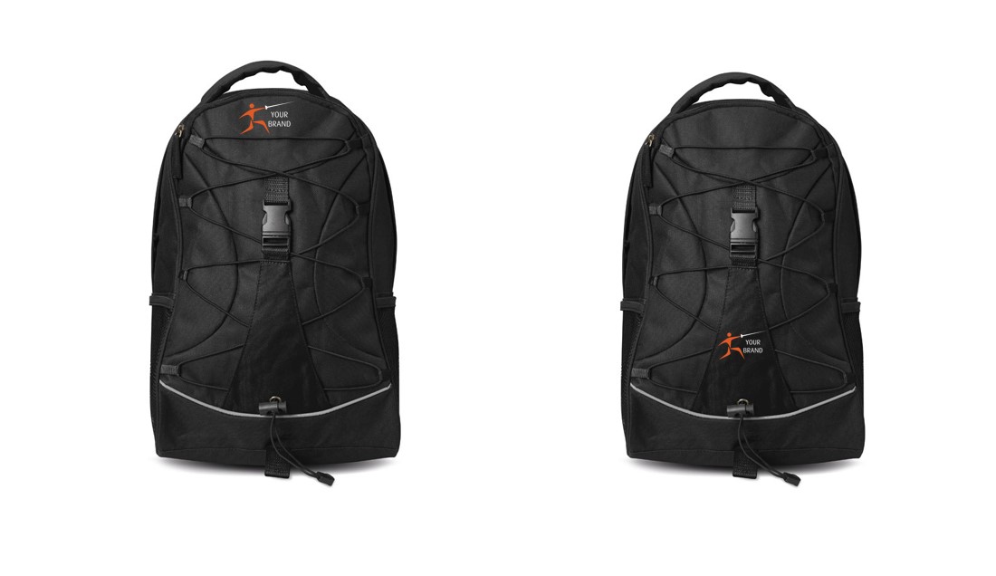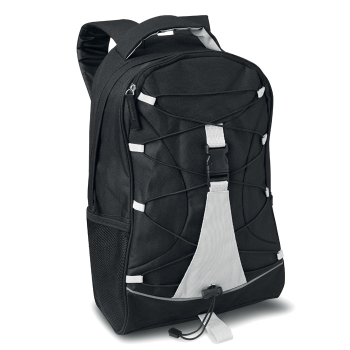 Backpack with colored parts in 600D polyester, drawstring on the front and mesh pockets on the sides.