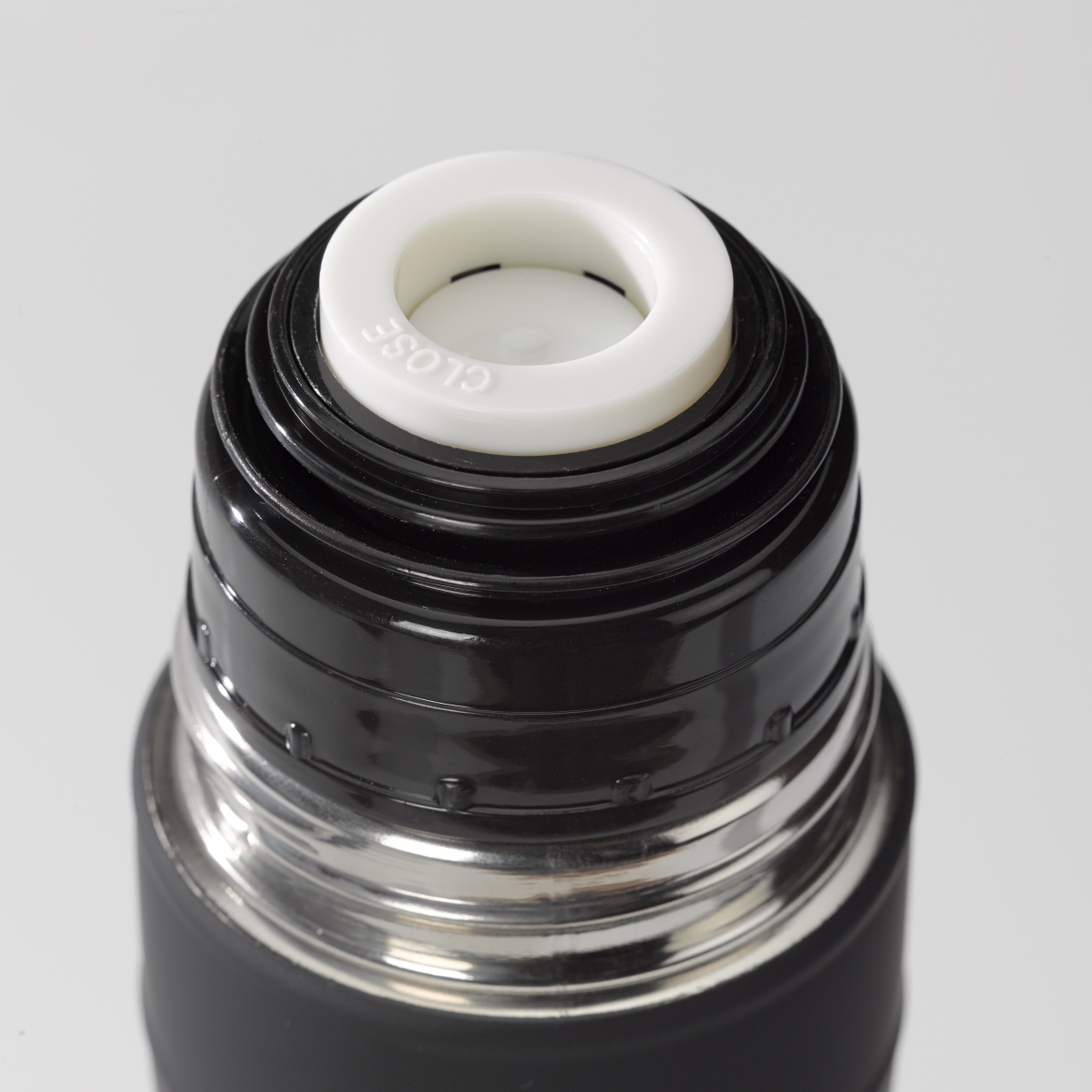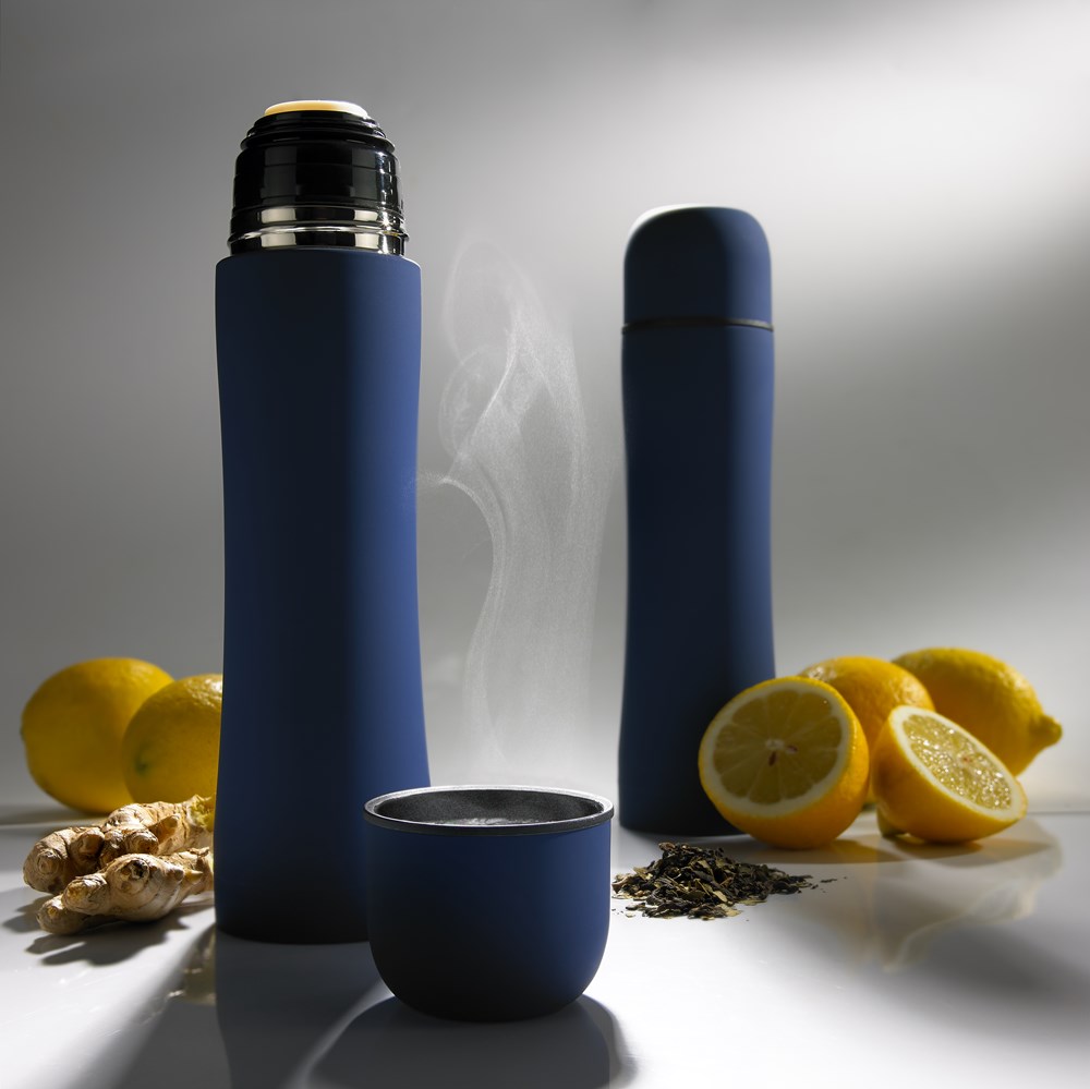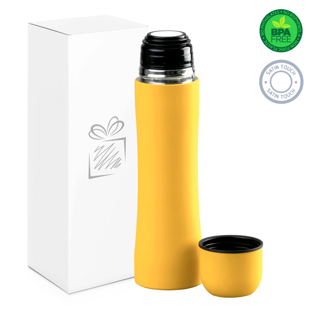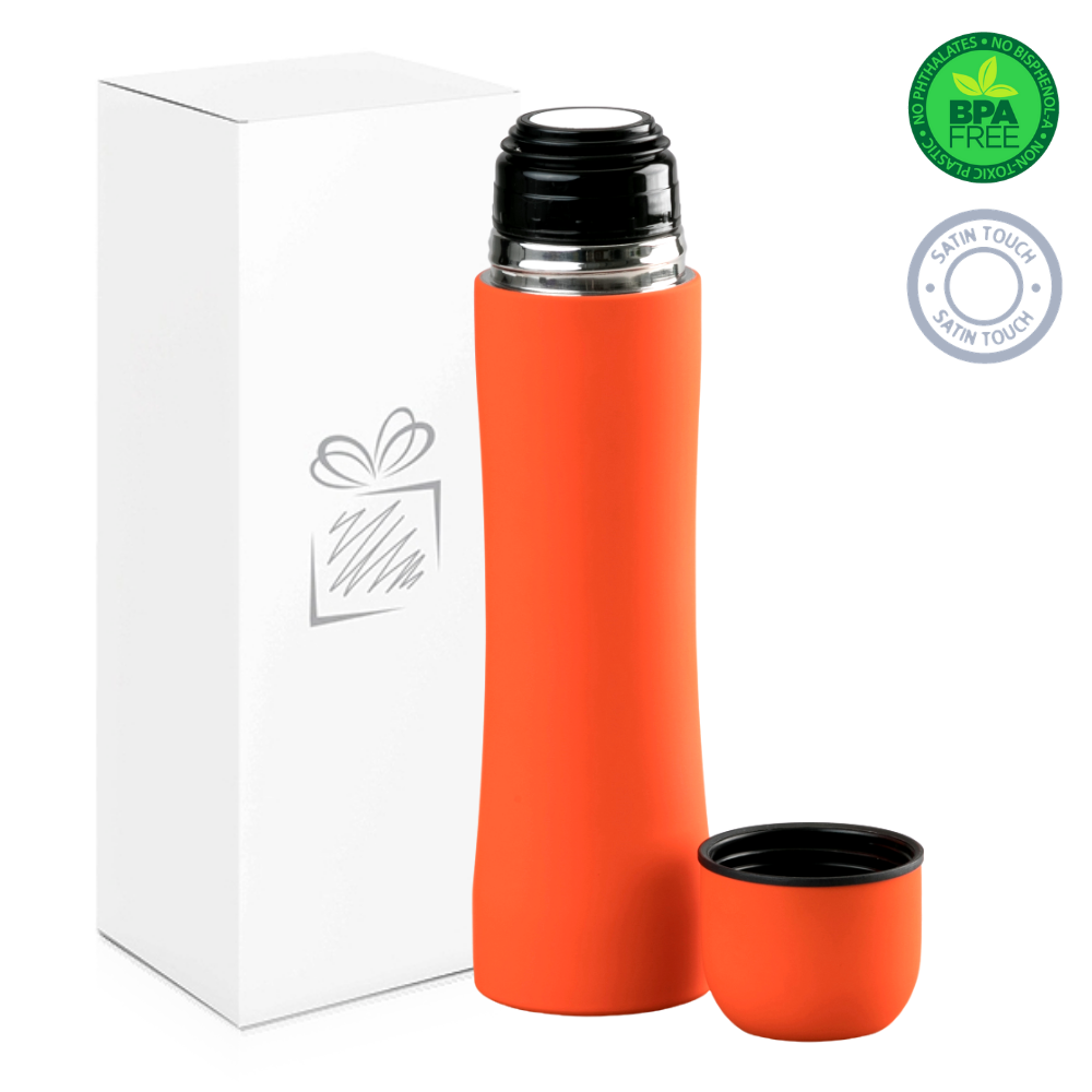 Watertight thermos, covered with a soft-touch rubber surface. Made of high quality stainless steel. The double-walled design keeps the contents warm for a long time (6 hours with the lid closed). Vacuum insulated. Certified for food contact and BPA FREE. The product is packaged in an elegant box. Capacity: 500ml.