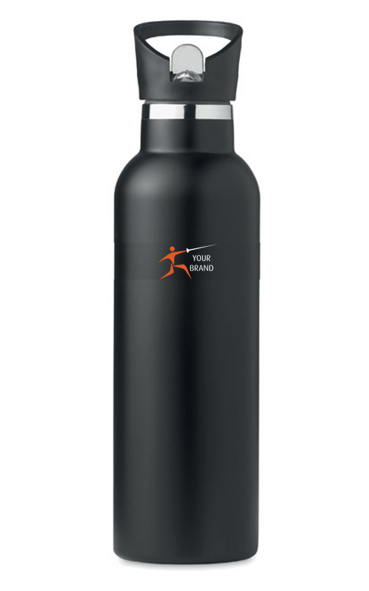 Insulated stainless steel thermos with anti-leak screw cap and additional built-in interchangeable straw cap. Supplied with neoprene carrying bag. Capacity: 700ml.