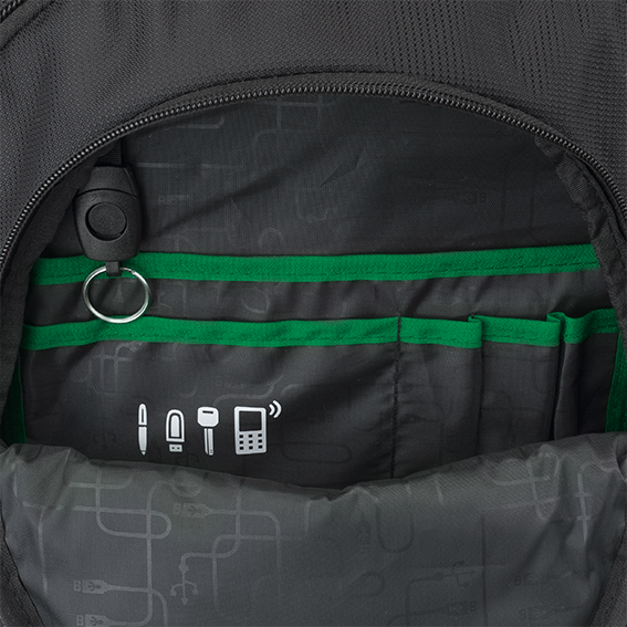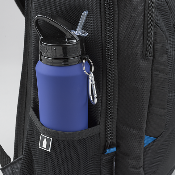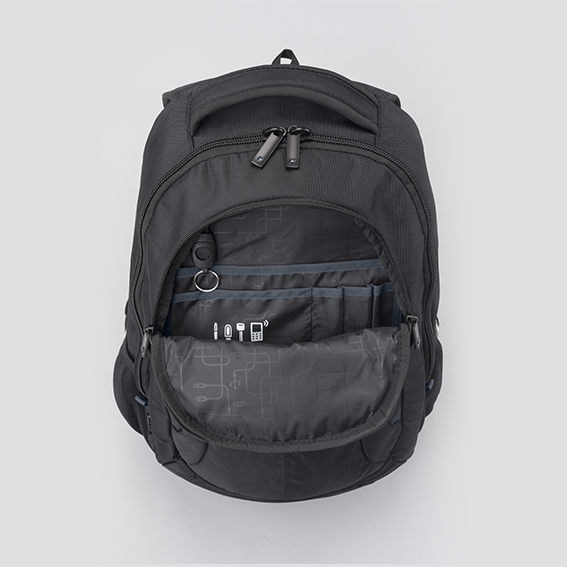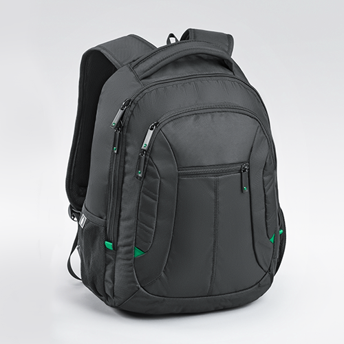 Voyager business backpack COLOR YOUR BRAND, made with top quality materials: 1680D polyester and dobby polyester. It has a large single compartment with a 15" laptop sleeve. Includes key ring, multiple pockets for organization and padded top handle for a convenient carrying option.