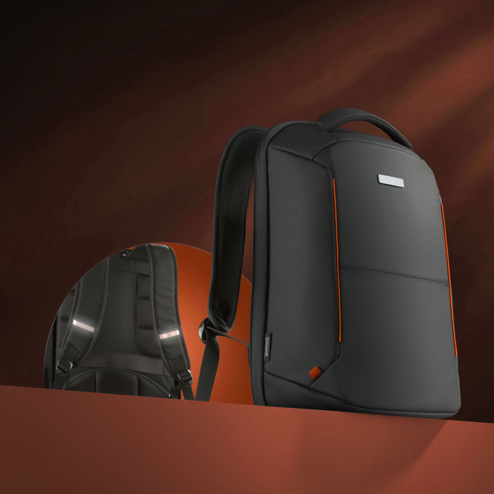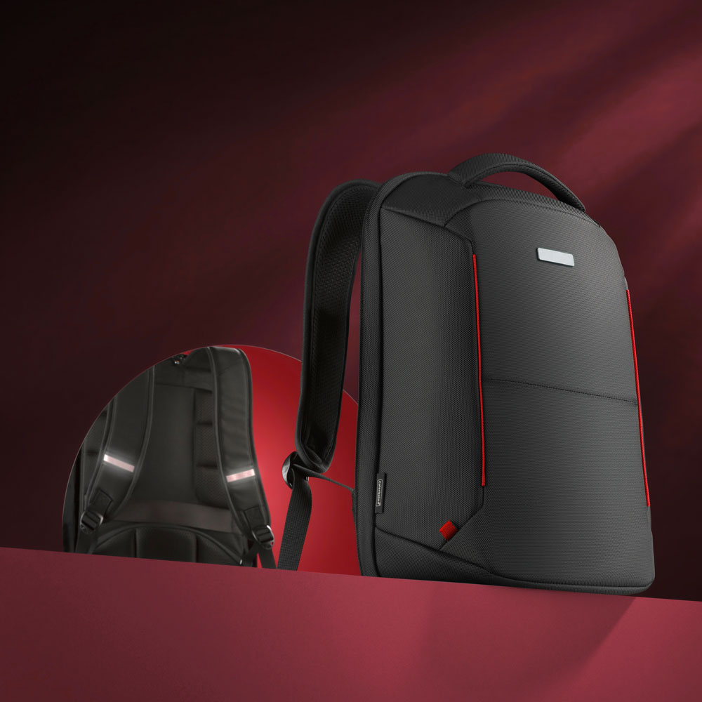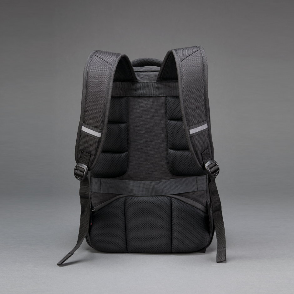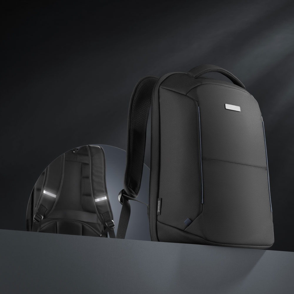 Access to the main compartment from the back and the additional security of the zip effectively protect the contents of the backpack from theft. The backpack is very well reinforced and stiffened, which increases resistance to cutting with a sharp tool. The backpack features a breathable back system, padded shoulder straps and a comfortable grip, which definitely increases the wearing comfort. Furthermore, there is a reflective system on the shoulder straps and a fastening strap for the suitcase.