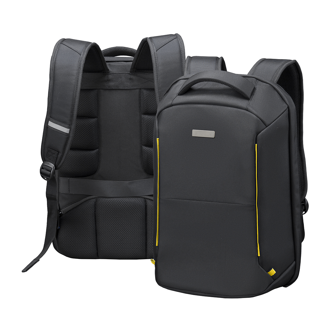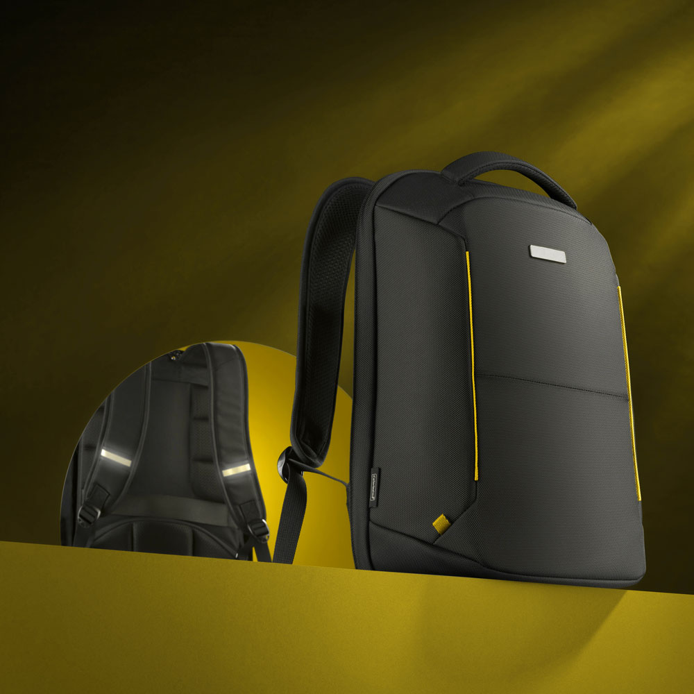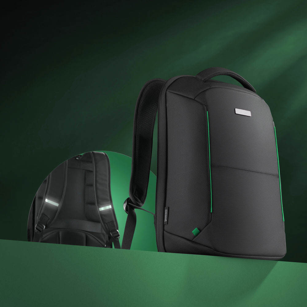 Access to the main compartment from the back and the additional security of the zip effectively protect the contents of the backpack from theft. The backpack is very well reinforced and stiffened, which increases resistance to cutting with a sharp tool. The backpack features a breathable back system, padded shoulder straps and a comfortable grip, which definitely increases the wearing comfort. Furthermore, there is a reflective system on the shoulder straps and a fastening strap for the suitcase.