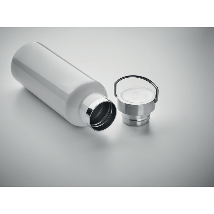 Bottiglia sottovuoto isolante a doppio strato in acciaio inox riciclato (90% acciaio inox riciclato e 10% acciaio inox) con coperchio con manico. Capacità : 500 ml.