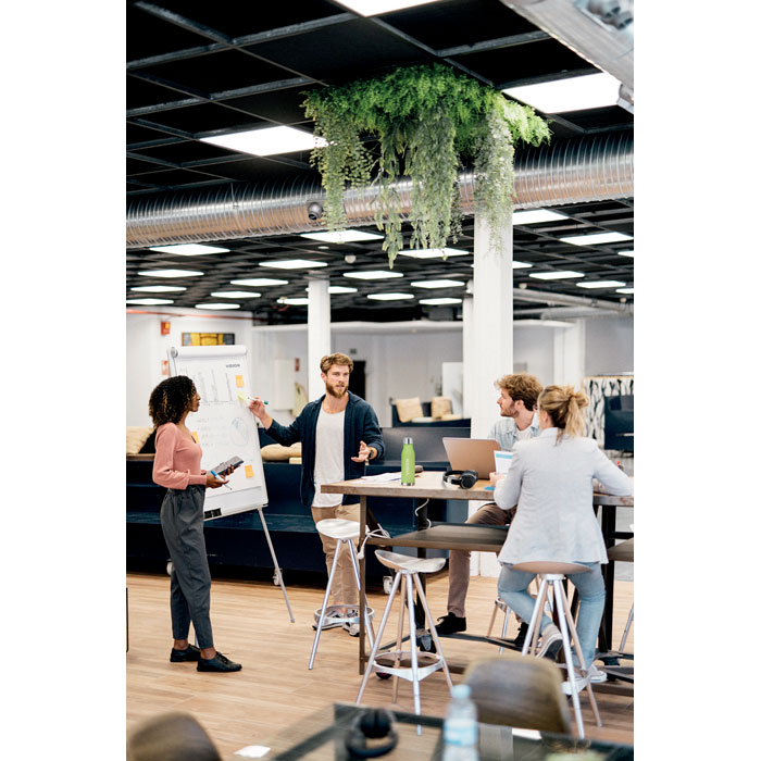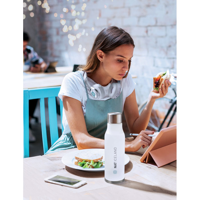Bottiglia in RPET in acciaio inossidabile e finitura gommata con interno in RPET e anello in silicone. BPA free. Anti goccia. Capacità 600ml. Non adatto a bevande gassate, alcoliche e a base di latte.Antigoccia.