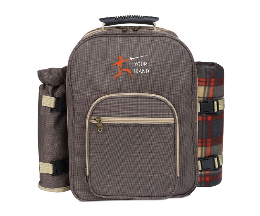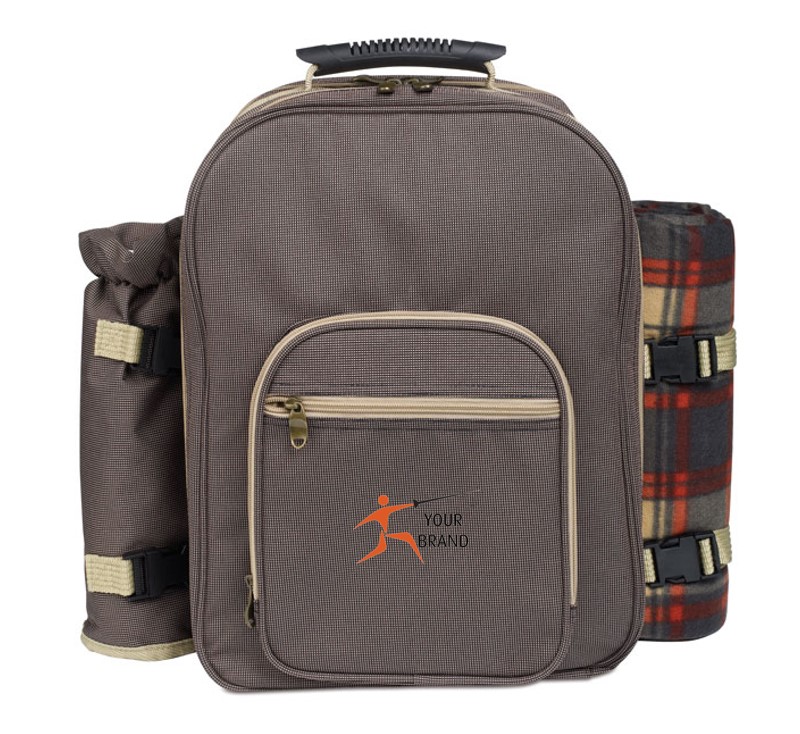Zaino picnic 4 persone con plaid, portabottiglie laterale, tasca frontale con doppia zip, utensili ed accessori di qualità . In poliestere 600D.