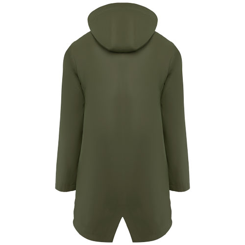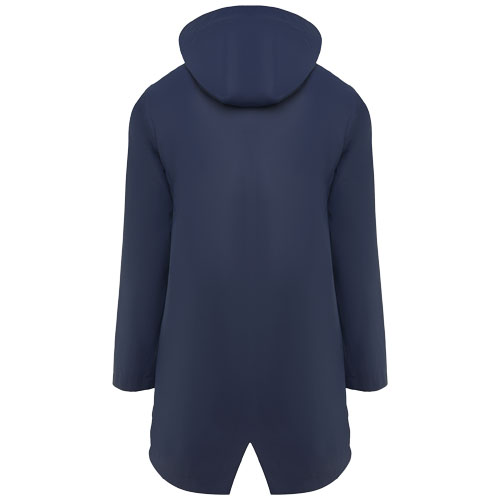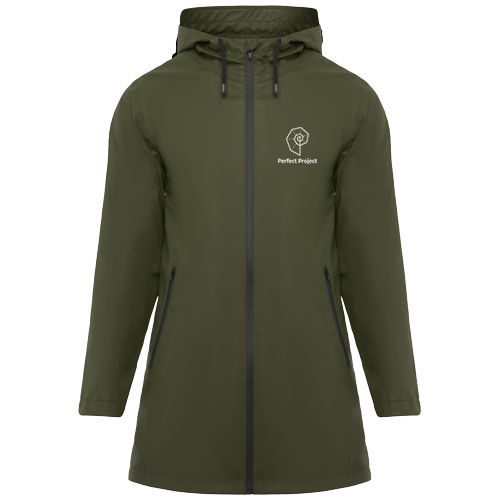 Giacca impermeabile da donna. Cappuccio con visiera. Cerniere e cuciture termosaldate. Dettagli a contrasto di colore nero. Due tasche laterali con cerniera. Fessure sul retro del cappuccio. Etichetta rimovibile. Impermeabile. La modella è alta 179 cm ed indossa una taglia S.