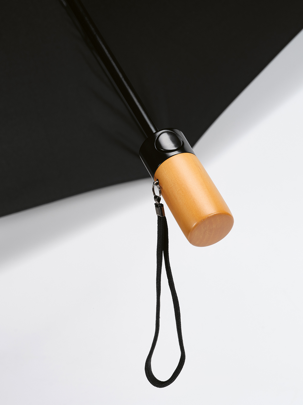 Ombrello pieghevole Jackson 27'' in rPET. Con apertura e chiusura automatica, è molto pratico da trasportare. Struttura resistente al vento in fibra di vetro, manico in legno e asta in alluminio riciclato. Fornito con custodia individuale in rPET.