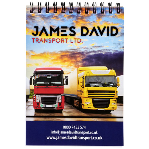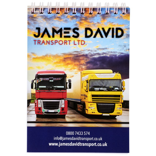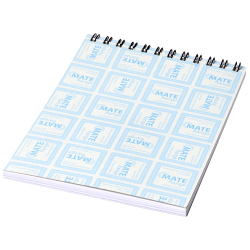 Blocco note spiralato di formato A6 Desk-Mate®. Questo blocco note include una spirale bianca o nera, una copertina frontale in carta lucida (250 g/m2) e carta bianca (80 g/m2). La versione standard include 50 fogli, disponibile inoltre in versione da 80 fogli. Puoi personalizzare le pagine di questo versatile blocco note con qualsiasi design - sia che tu voglia fogli a righe, a quadretti o puntinati - tutto è possibile!