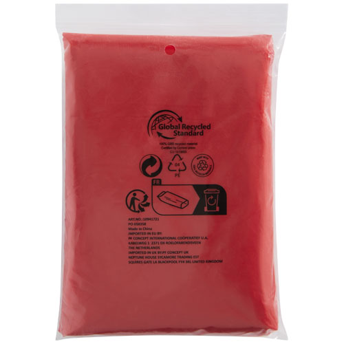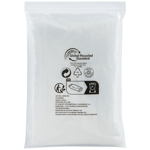Il poncho impermeabile monouso taglia unica Mayan è realizzato in plastica certificata GRS al 100%. Questo poncho trasparente con cappuccio è ideale da avere a portata di mano in caso di temporali durante un festival o qualsiasi altro evento all'aperto. Fornito all'interno di una custodia adatta alla stampa. Dimensione: 90 x 120 cm.