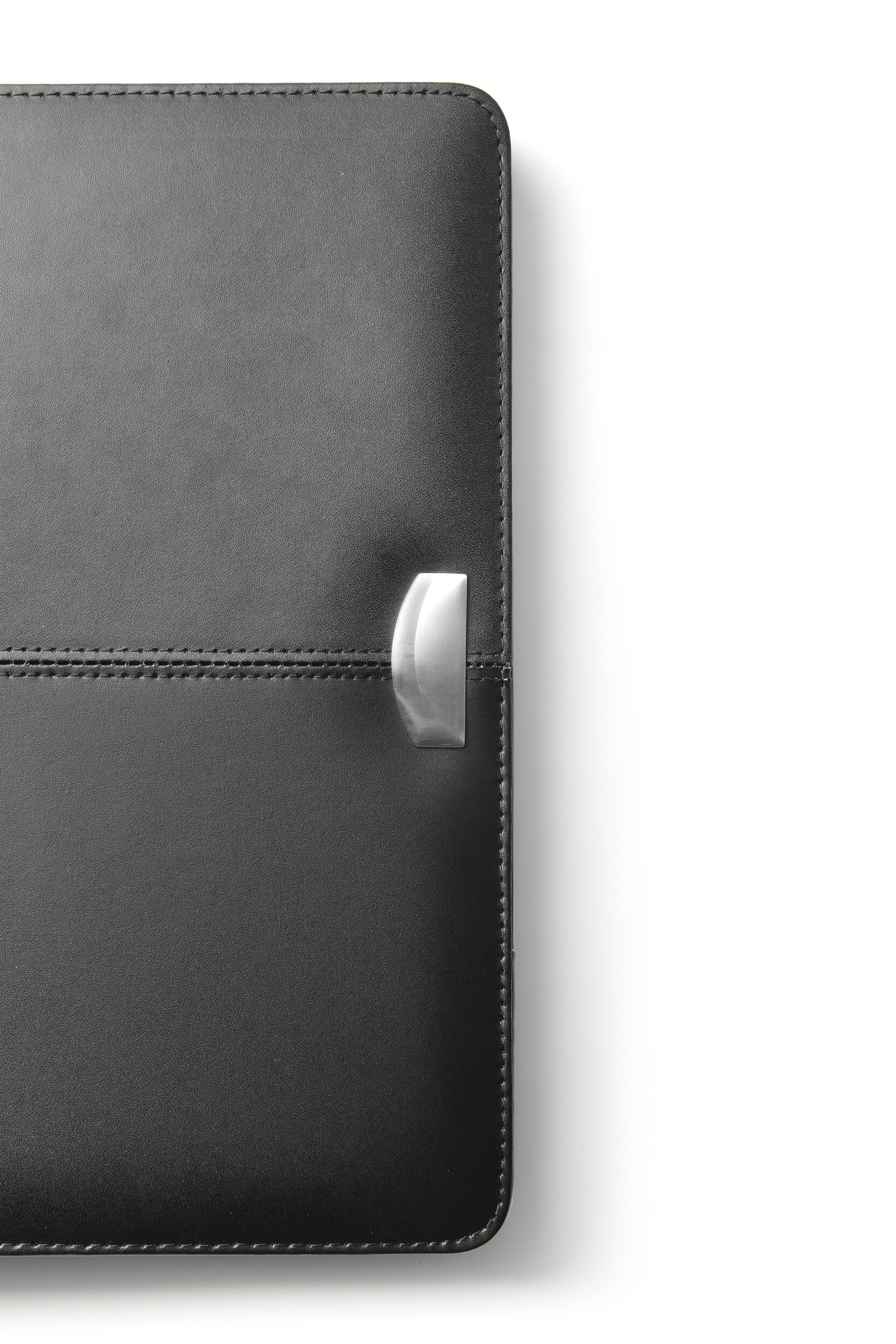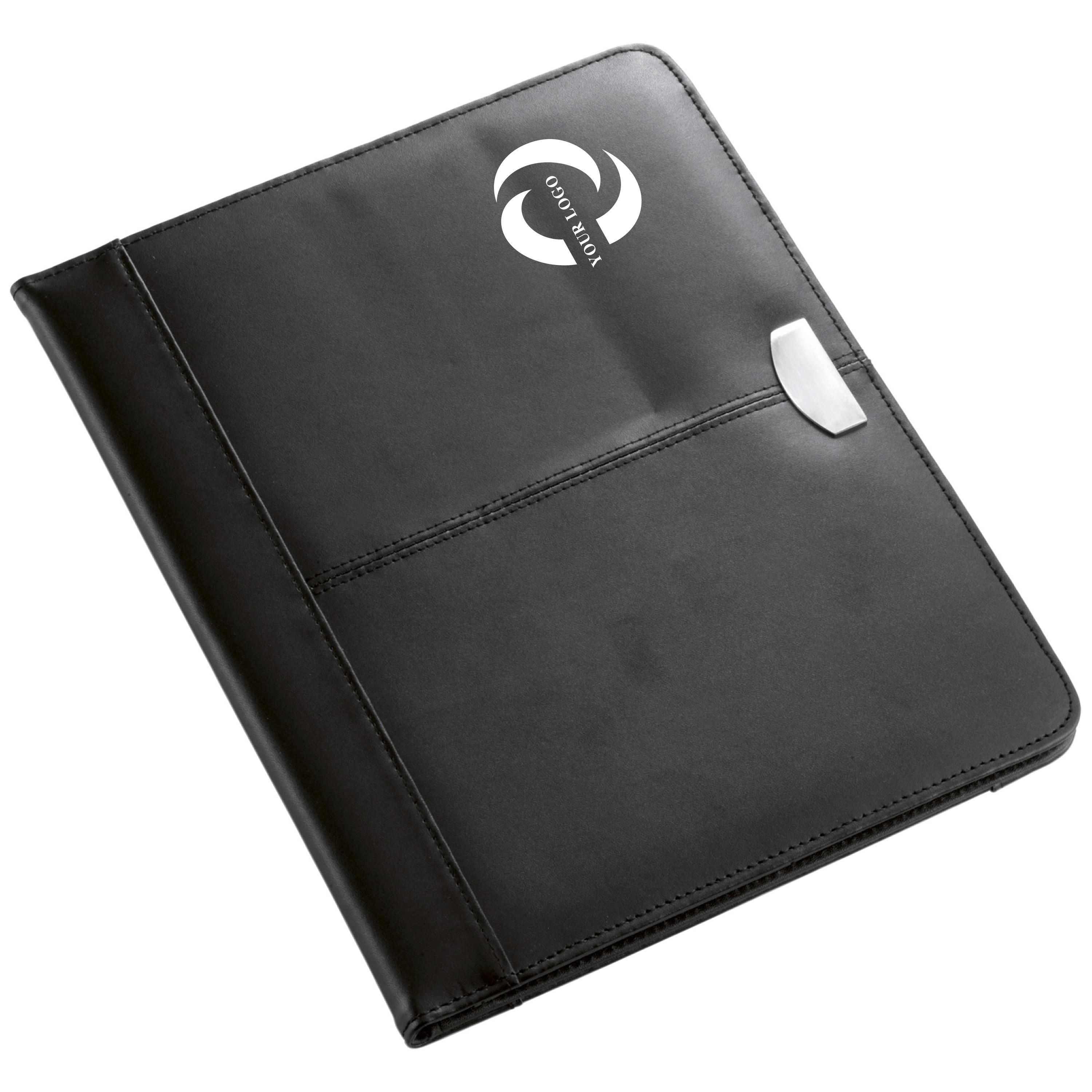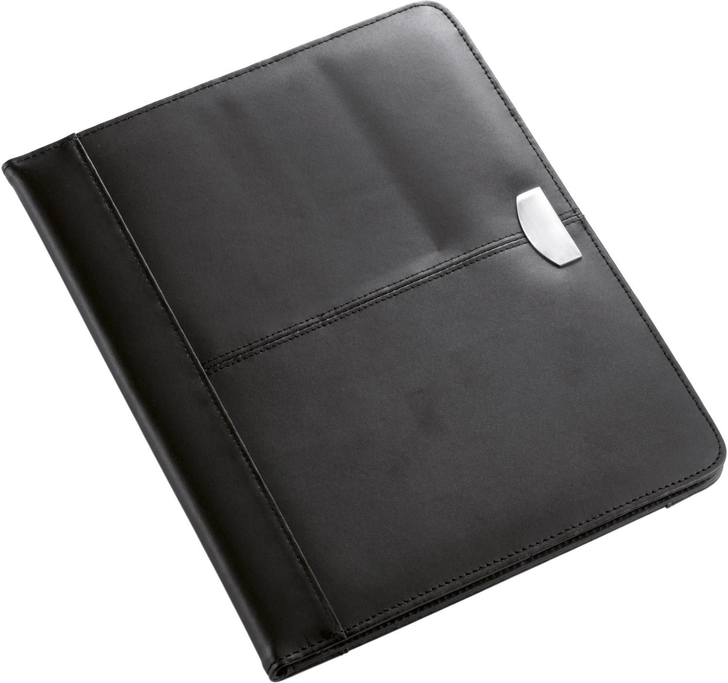 Portablocco formato +/- A4, targhetta in metallo, blocco da 25 pagine a righe incluso, passante per penna (non inclusa), vari scomparti, in similpelle