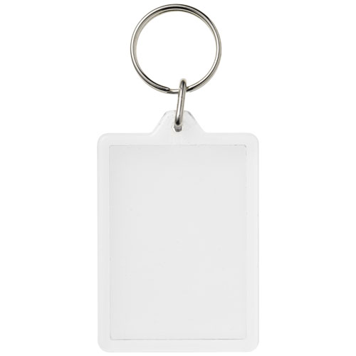 Portachiavi C1 rettangolare trasparente con anello in metallo diviso. L'anello di metallo a loop ha un profilo piatto ideale per le spedizioni. Dimensioni dell'inserto stampato: 5,0 cm x 3,5 cm.