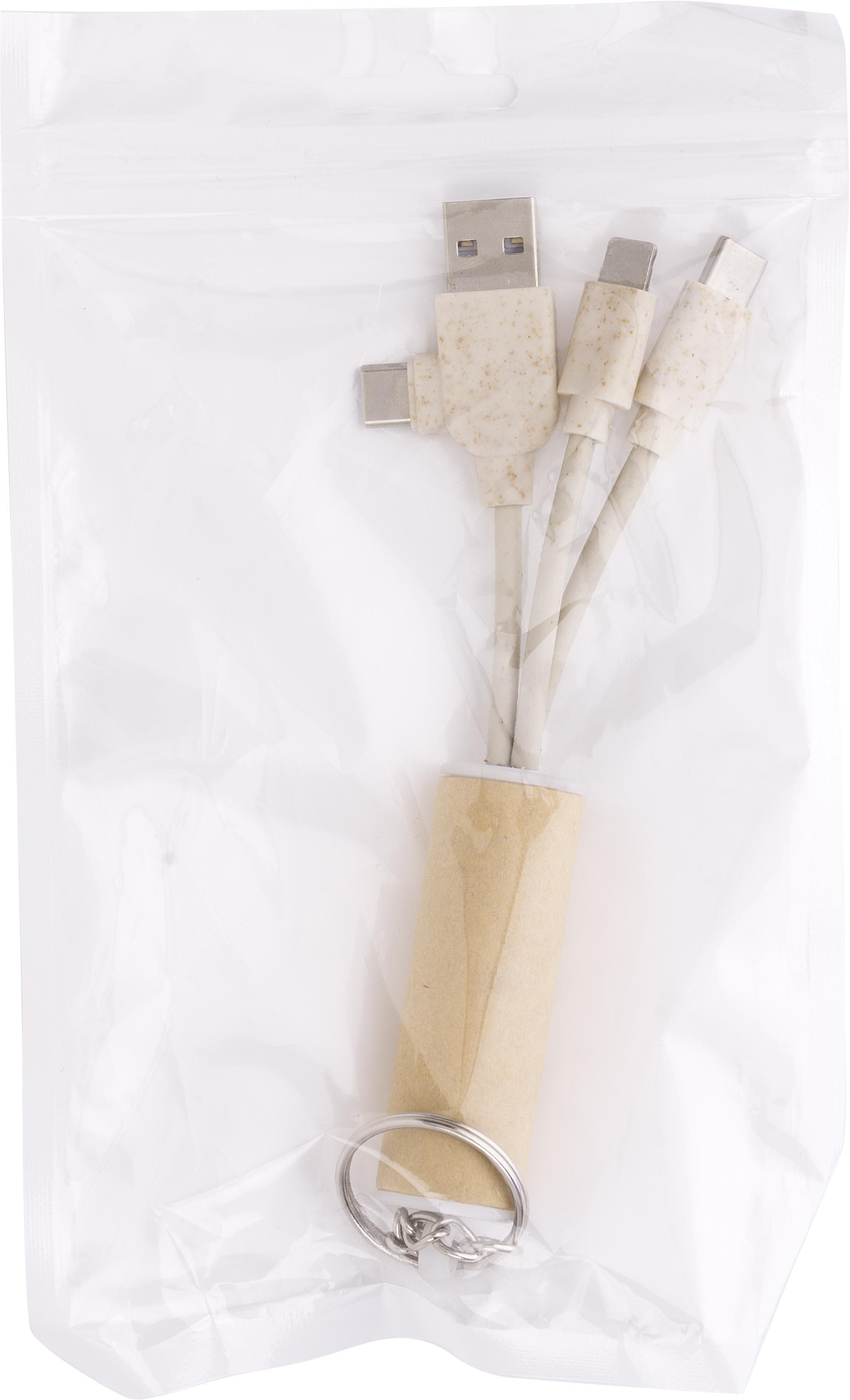 Portachiavi con cavi per la ricarica USB, realizzato in carta, include connessioni USB Typ C, micro USB e Lightning, confezionata singolarmente in una custodia in carta