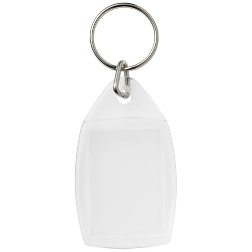 Portachiavi P5 trasparente con anello in metallo diviso. Dimensioni dell'inserto stampato: 3,5 cm x 2,4 cm.