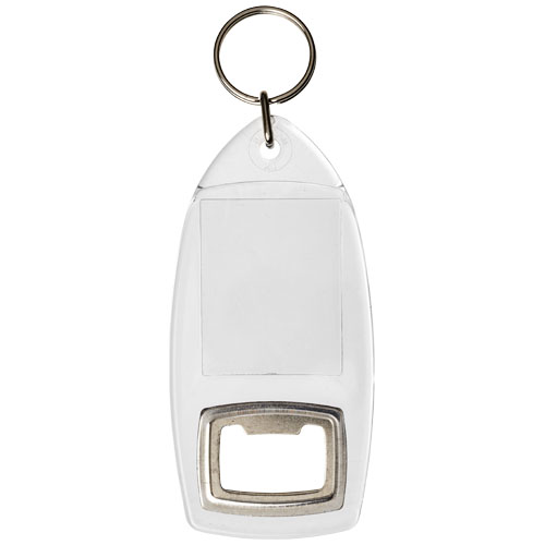 Portachiavi R1 trasparente con apribottiglie e anello in metallo diviso. L'anello di metallo a loop ha un profilo piatto ideale per le spedizioni. Dimensioni dell'inserto stampato: 4,0 cm x 3,2 cm.