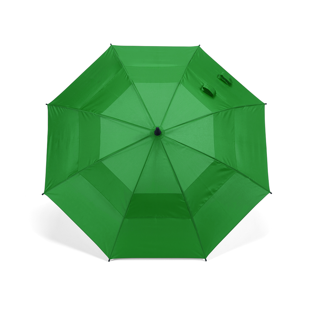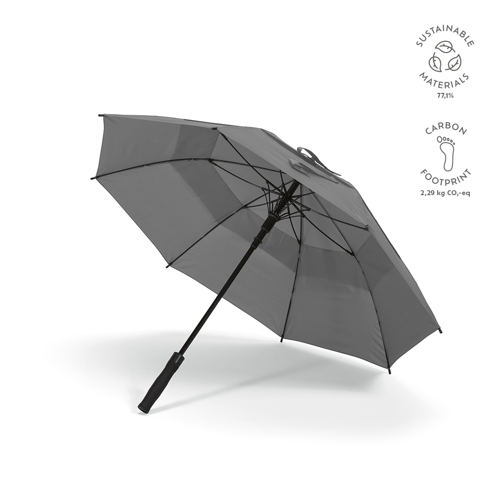 Ombrello Prince 23'' in rPET. Resistente al vento con struttura in fibra di vetro, manico verticale in rABS e 8 pannelli. Apertura automatica per una protezione rapida. La striscia in velcro chiude la doppia copertura. Confezione ecologica in custodia individuale in rPET. Rimani asciutto con stile personalizzando il logo nell’area dedicata sul manico.