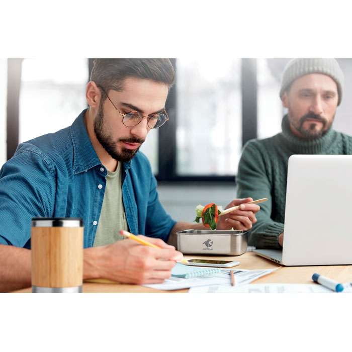 Portapranzo in acciaio inossidabile con coperchio in bamboo e 2 posate con fascia in poliestere removibile. Capacità 600 ml. Il bamboo è un prodotto naturale, potrebbero esserci lievi variazioni di colore e dimensioni da un articolo all'altro, che possono influire sul risultato finale della personalizzazione.