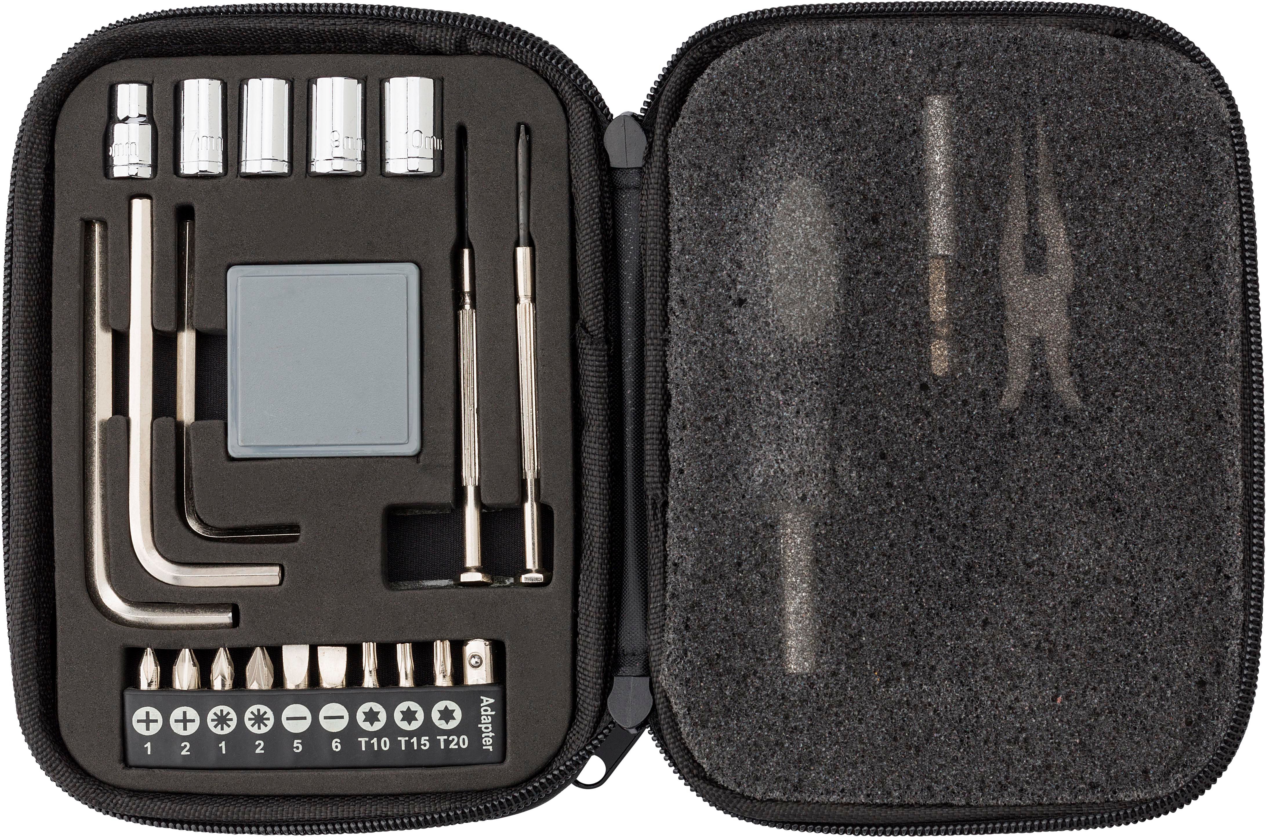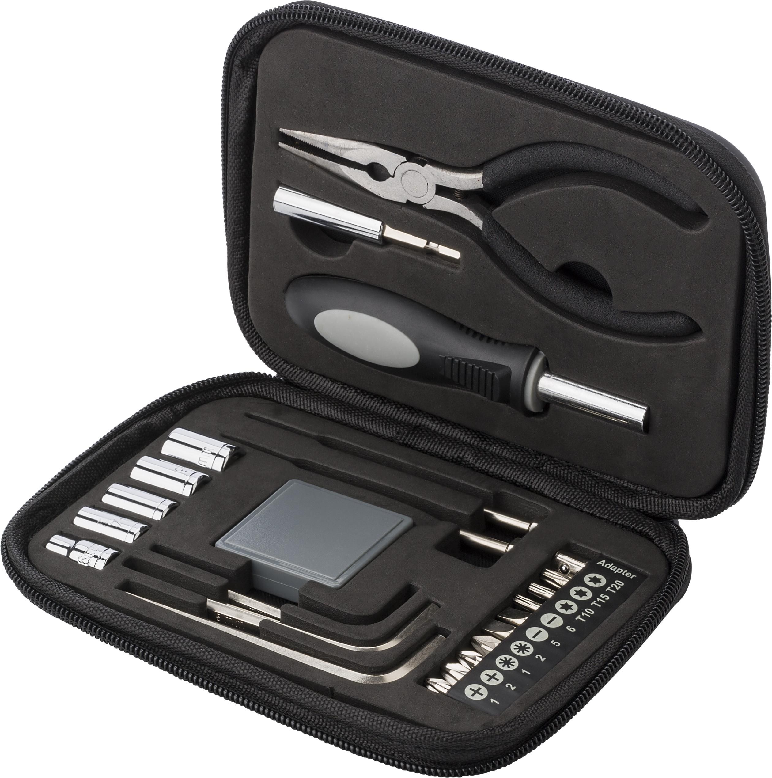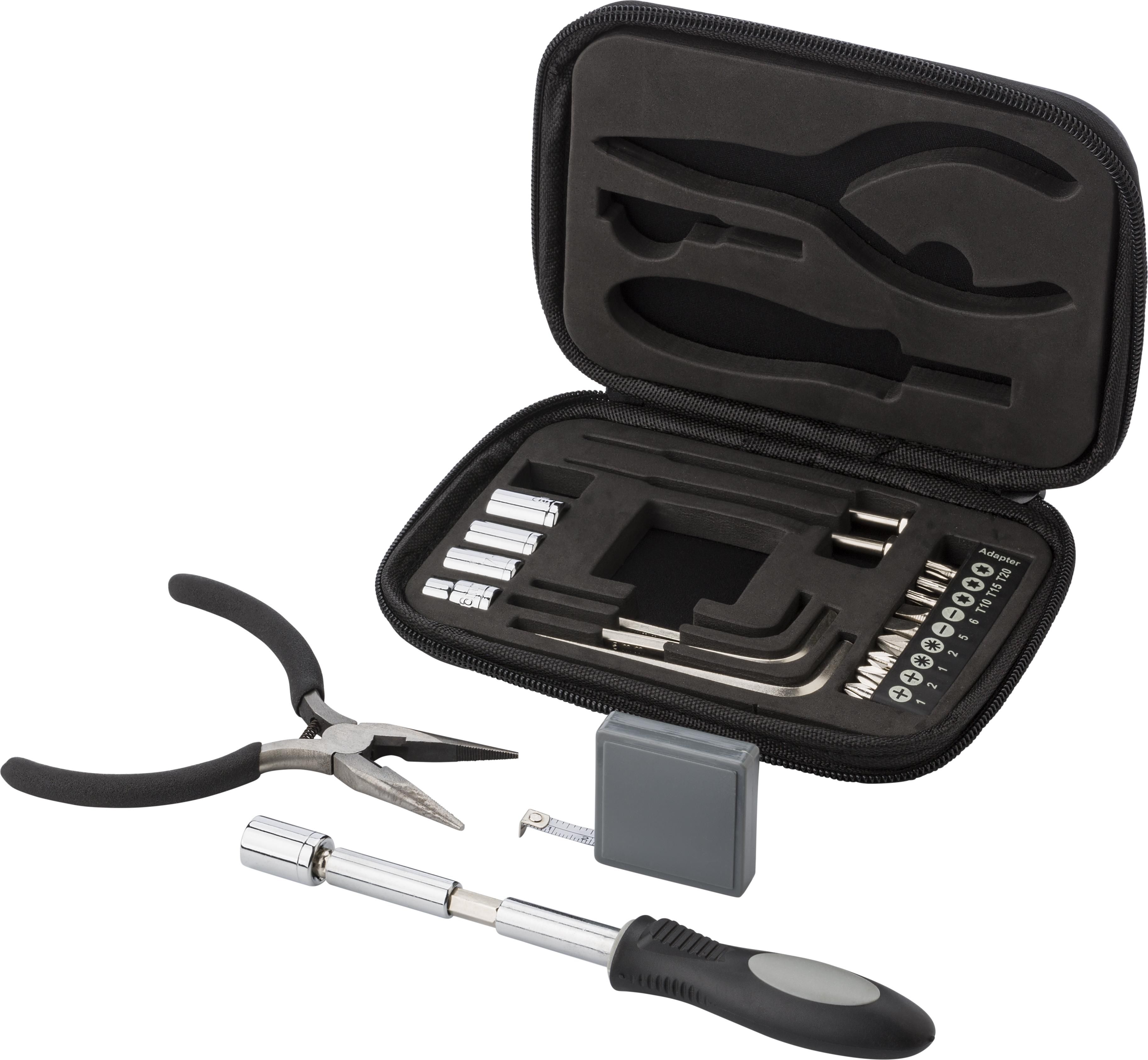 Set attrezzi in metallo 24 pezzi, composto da 5 bussole, 3 cacciaviti esagonali, 9 punte per viti, 1 bussola, flessometro da 1 metro, 2 cacciaviti di precisione, 1 impugnatura per cacciavite, 1 prolunga, 1 pinza, chiusura a lampo, custodia in PU