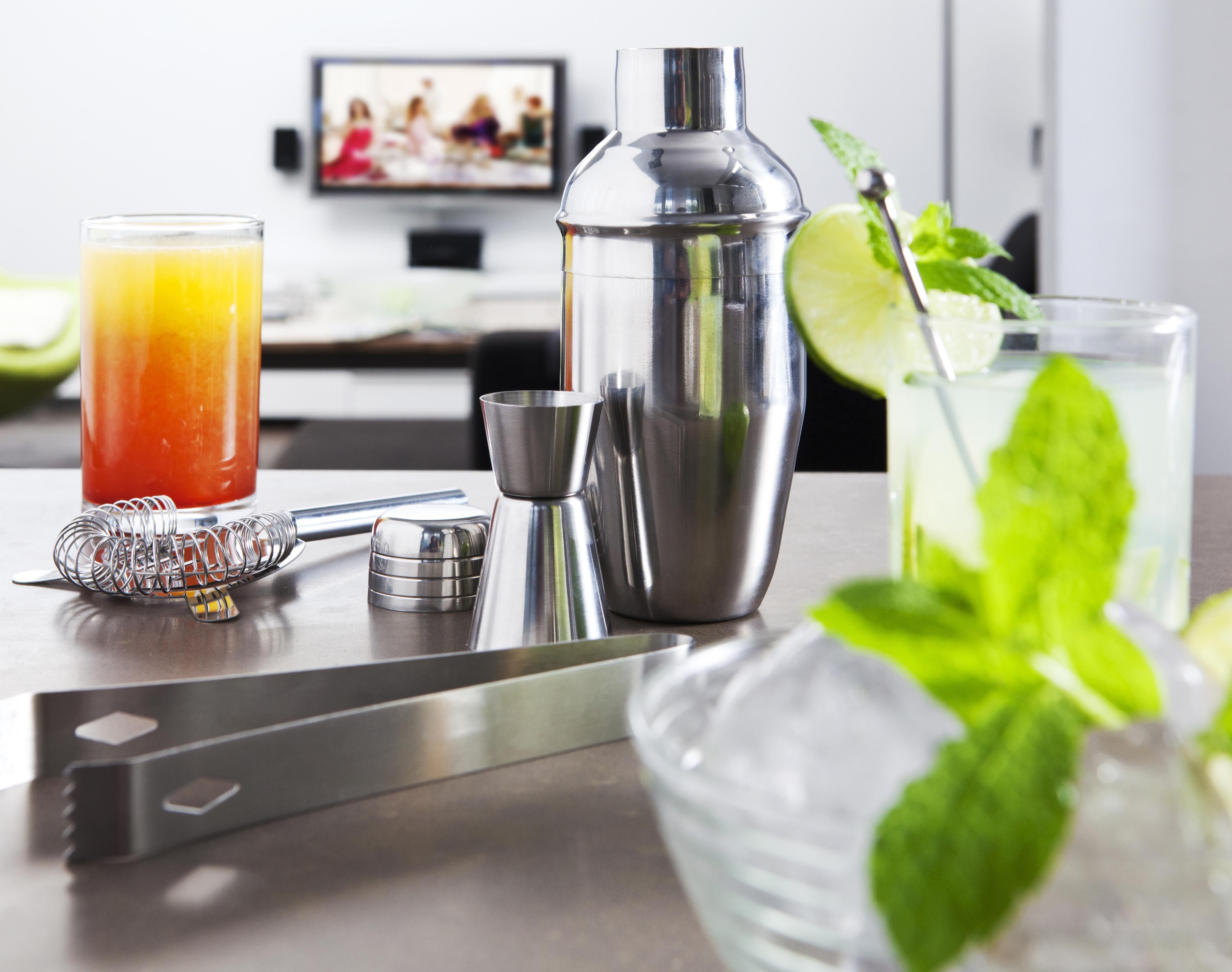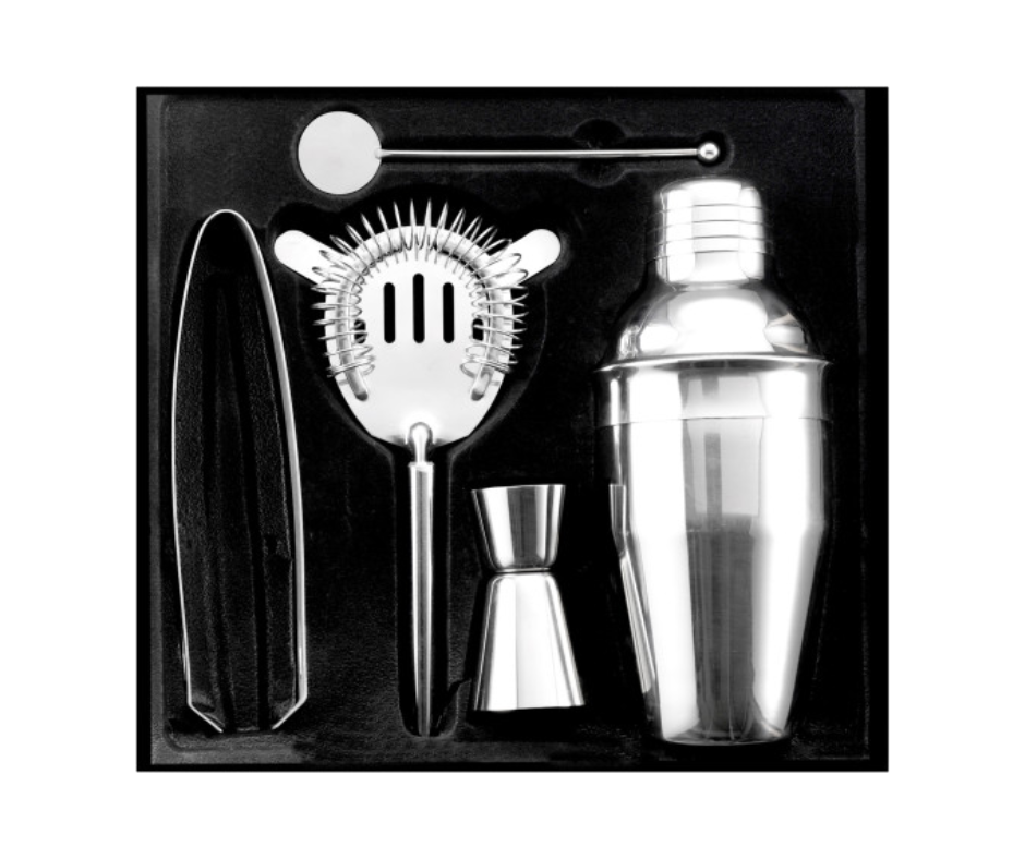 Set cocktail in acciaio inox, 5 accessori composto da shaker con capacità 350 ml, cucchiaio, pinze, setaccio e misurino, confezione regalo