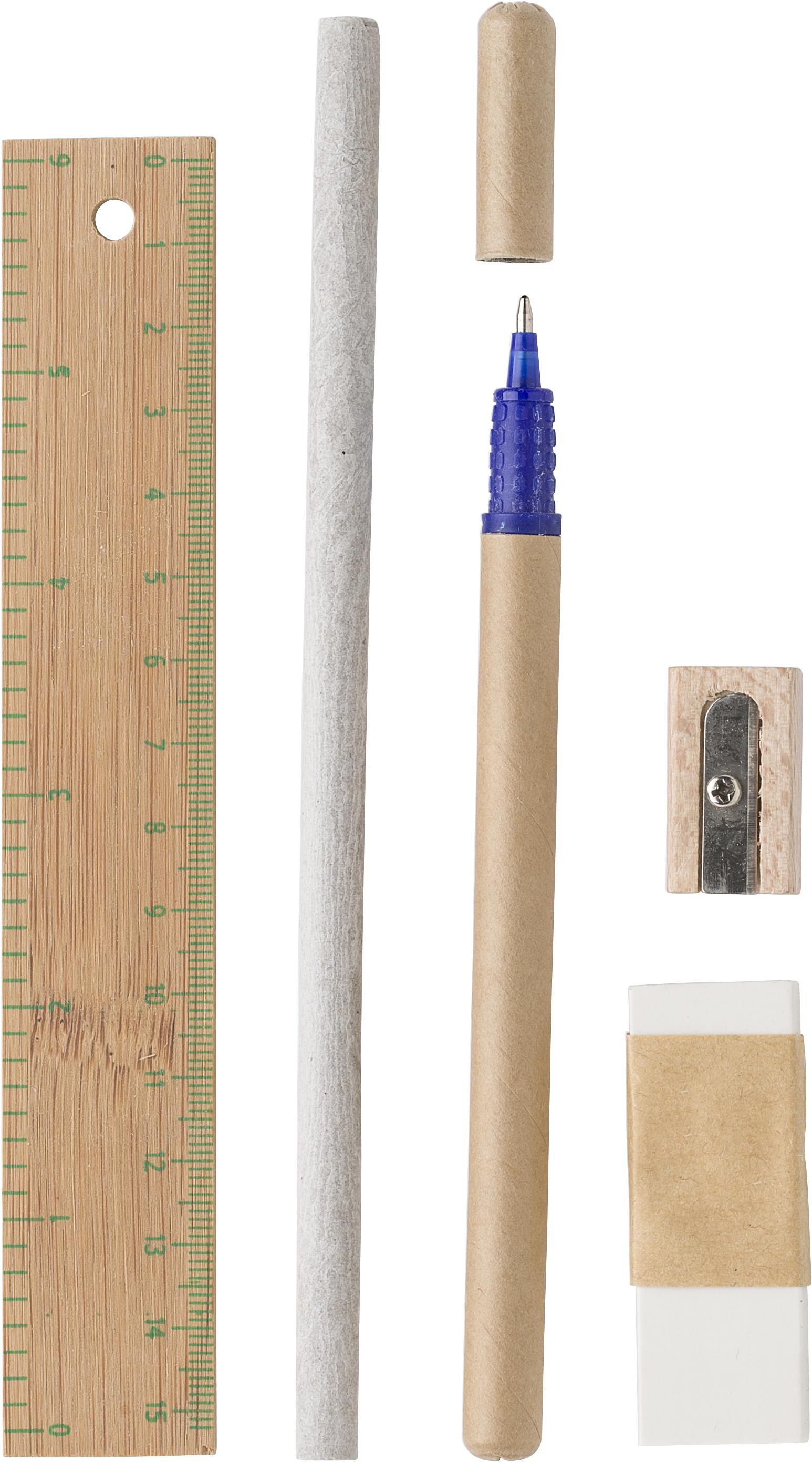 Set da disegno in cotone, composto da righello di bamboo, temperamatite in legno, gomma, matita, penna a sfera in cartone e ABS, refill blu