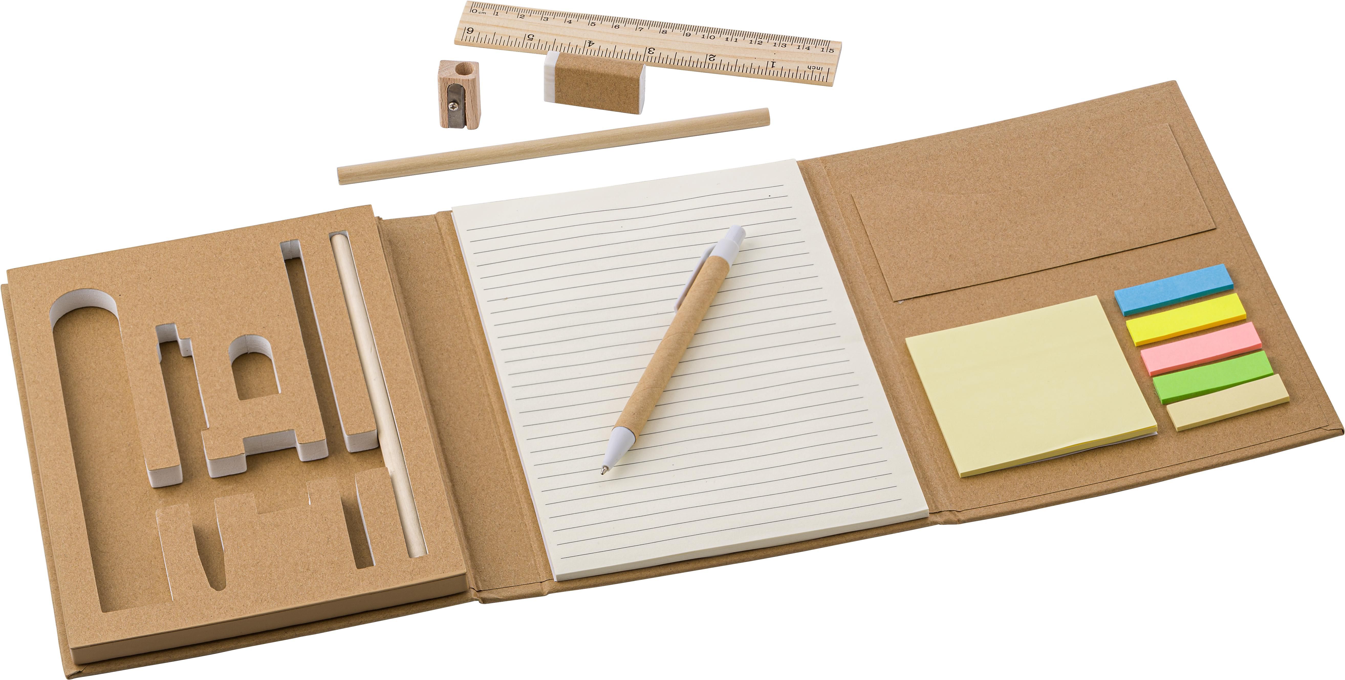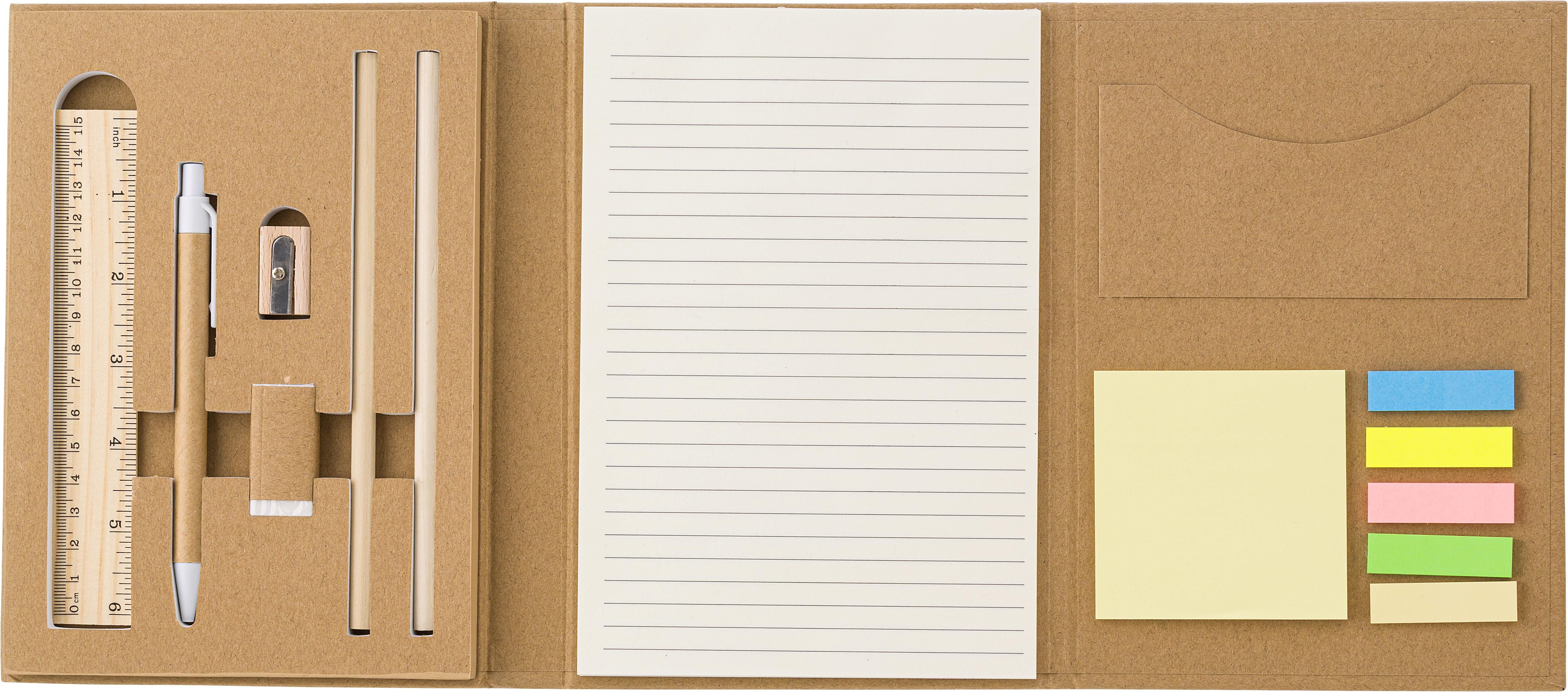 Set di scrittura in cartone, comprende taccuino con 40 pagine a righe, righello in bamboo 15 cm, due matite, un temperamatite, una gomma, memo stick in vari colori, tasca interna, penna a sfera in cartone, refill blu