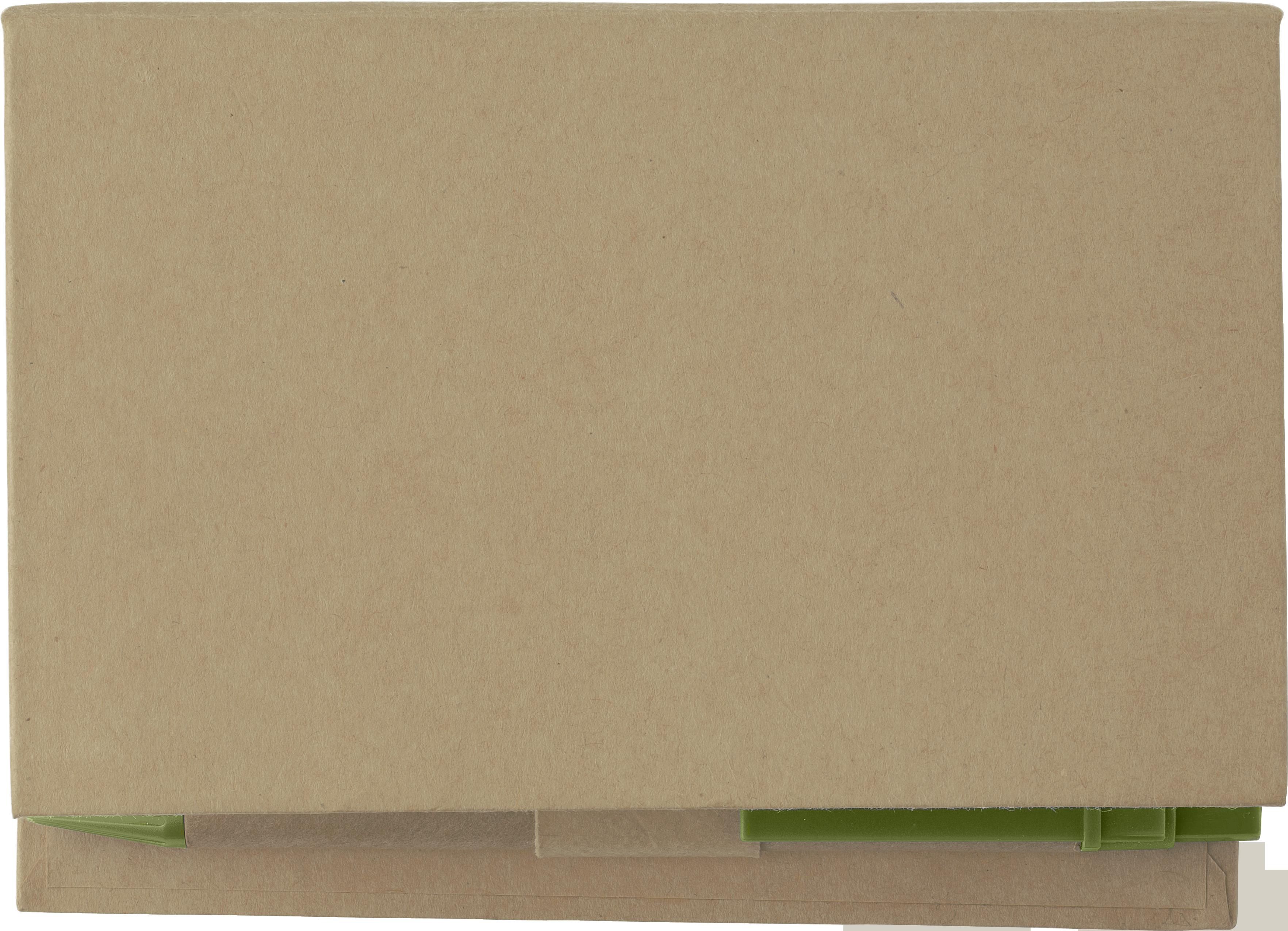 Set memo in cartone, composto da memo stick in vari colori, righello, penna a sfera con corpo e clip in cartone, refill blu