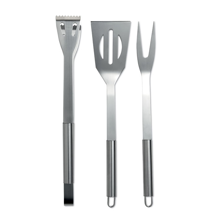 Set di tre accessori in acciaio: spatola, pinza e forchettone. Confezione in TNT nera con chiusura zip.