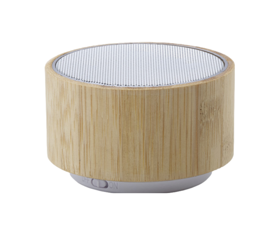 Speaker wireless in bamboo ed ABS, funzione luci multicolore, potenza 3 watt, batteria ricaricabile Li-on 300 mAh, durata di 3 ore circa, cavo micro USB incluso, confezione regalo bianca