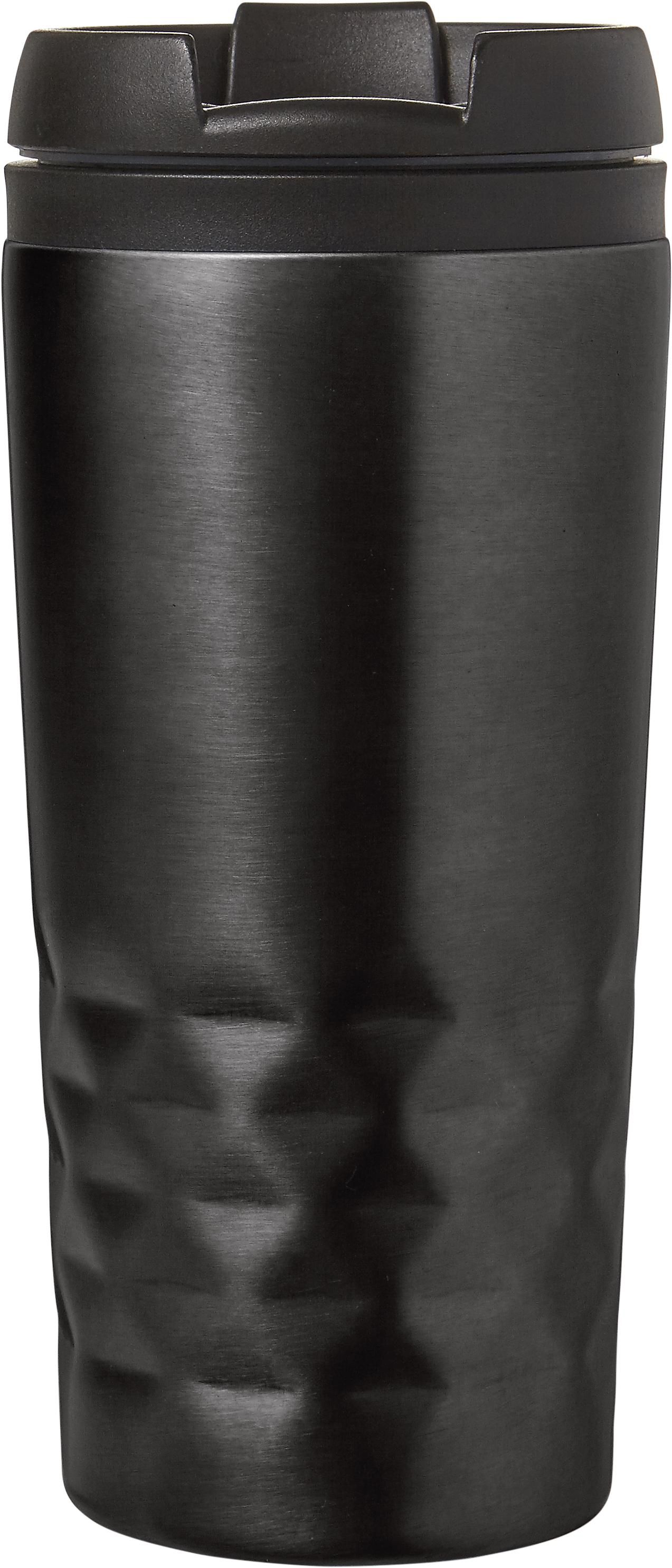Tazza termica da viaggio, doppia parete, acciaio inox, capacità 300 ml. A temperatura ambiente, mantiene il liquido approssivamente 3 ore freddo e 2 ore caldo.