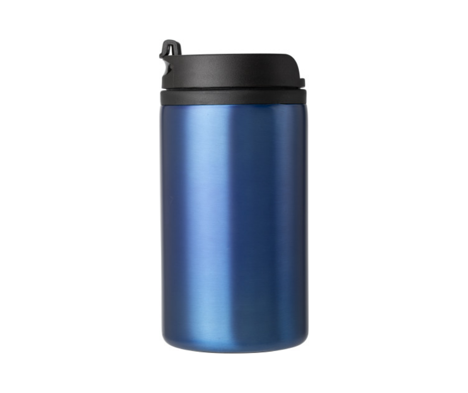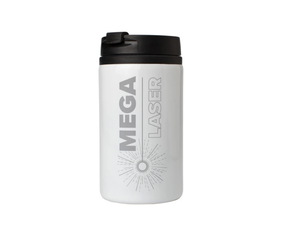 Tazza termica in acciaio inox, doppia parete, esterna in acciaio inox, interna in ABS, coperchio a vite a prova di perdita, dotato di apertura a scatto, impugnatura antiscivolo, capacità 300 ml. A temperatura ambiente maniente approssivamente il liquido freddo 2 ore e caldo 1 ora. Si sconsiglia l'incisione laser sul colore rosso (008).