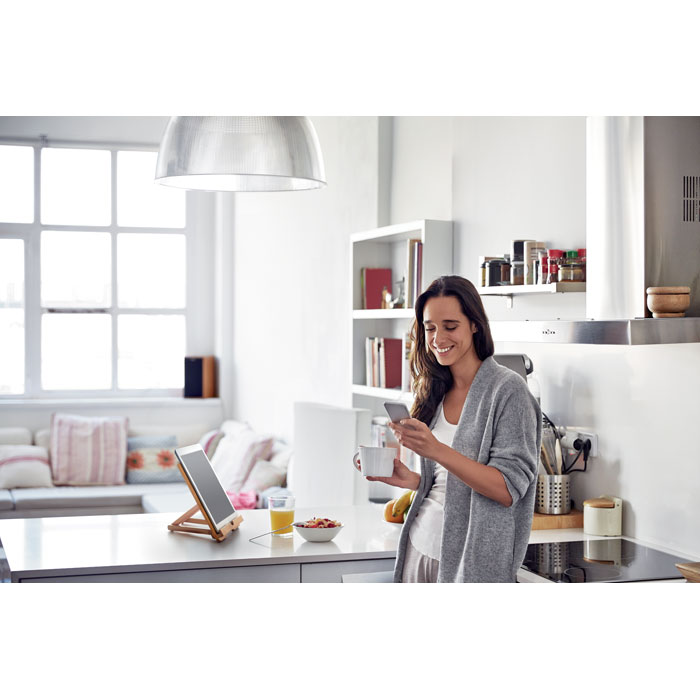 Supporto pieghevole per tablet o smartphone in bamboo. Guardate i video preferiti di YouTube o Netflix su questo supporto pieghevole oppure usatelo per fare videochiamate o anche live-stream. L'apertura nella parte inferiore del supporto consente il passaggio dei cavi di ricarica o degli auricolari. Il bamboo è un prodotto naturale, potrebbero esserci leggere variazioni di colore e dimensione per articolo, che possono influenzare il risultato finale della personalizzazione.
