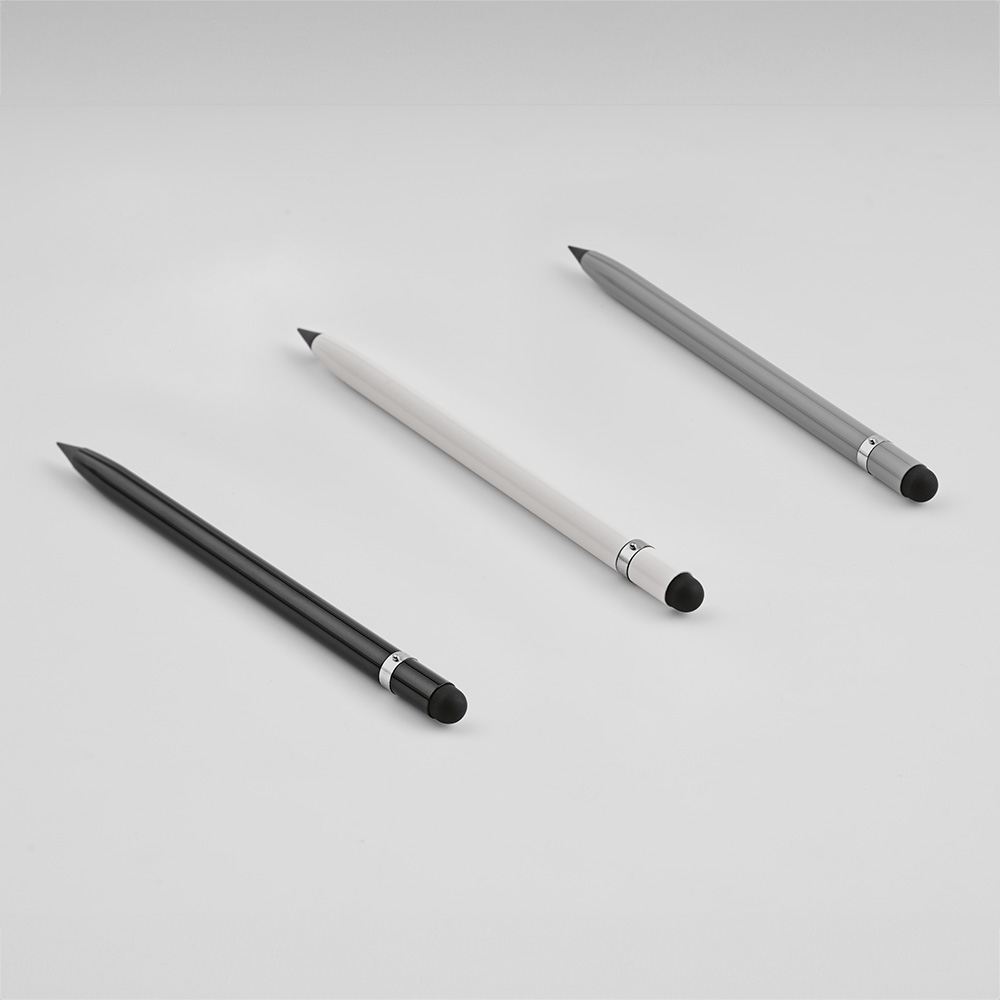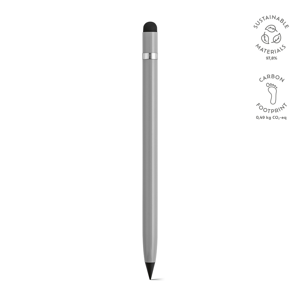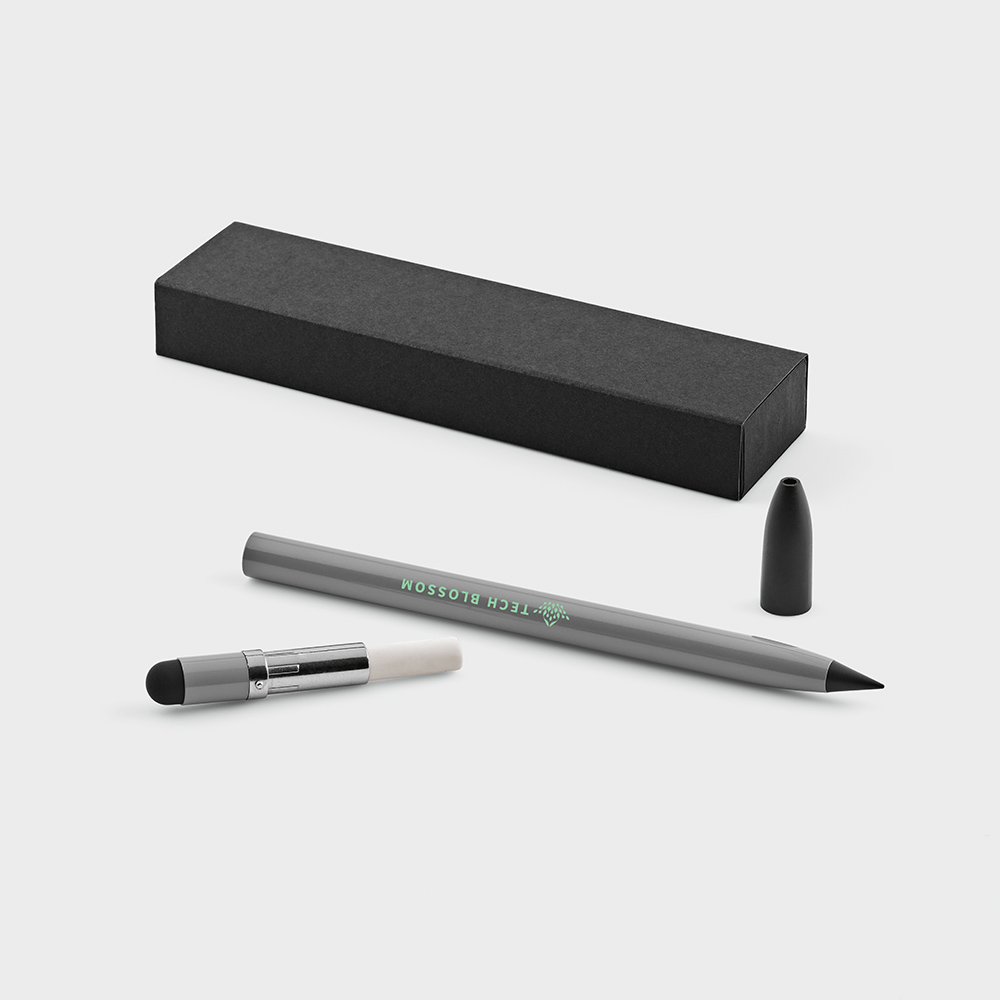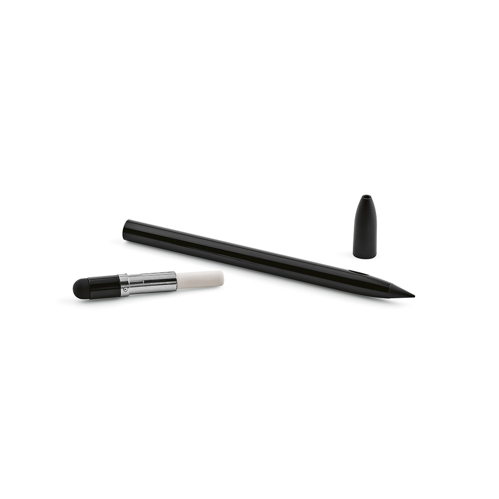 Penna senza inchiostro Voltaire con punta in grafite, realizzata in alluminio riciclato. Questa penna rivoluziona la scrittura grazie al dettaglio argento, alla gomma interna e alla punta touch. Presentata in una confezione singola nera in carta riciclata.