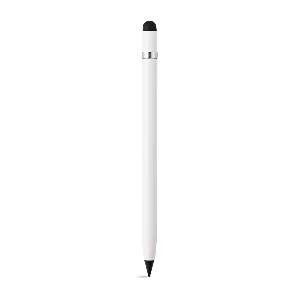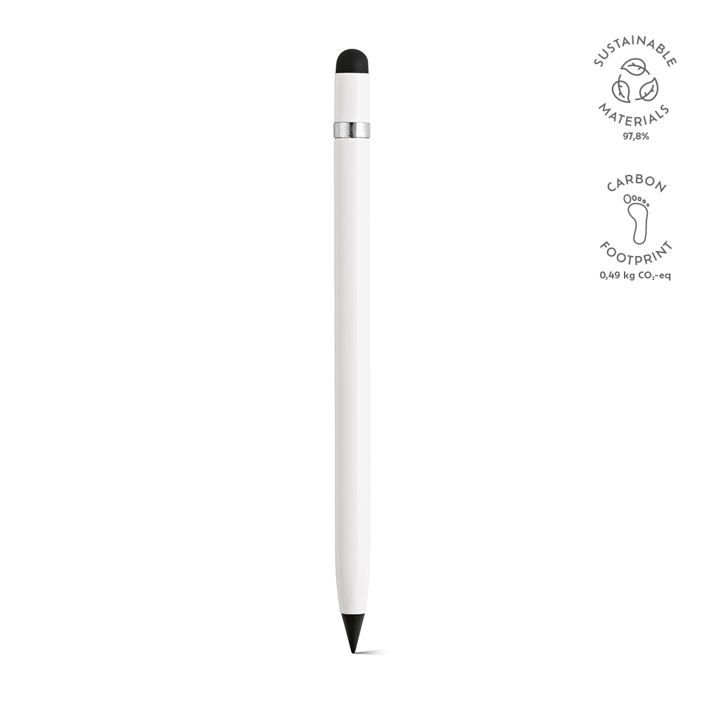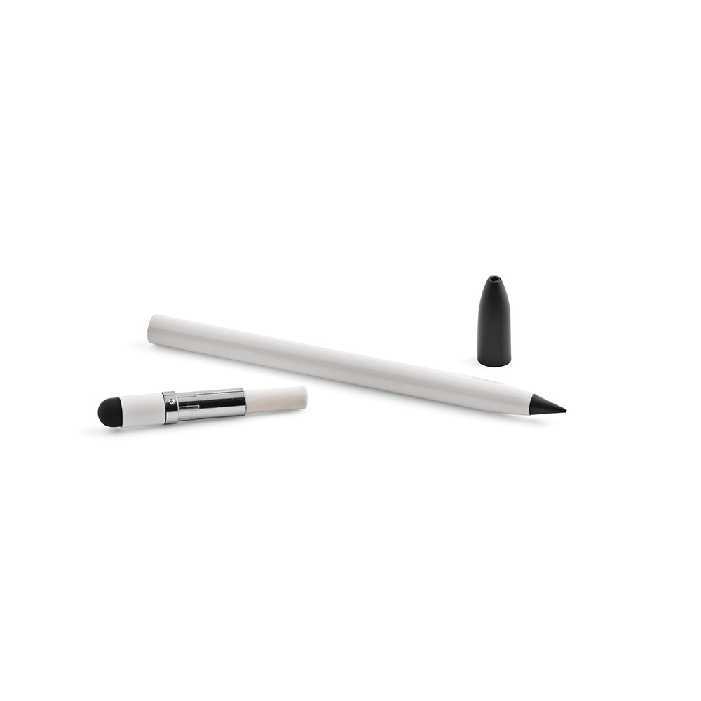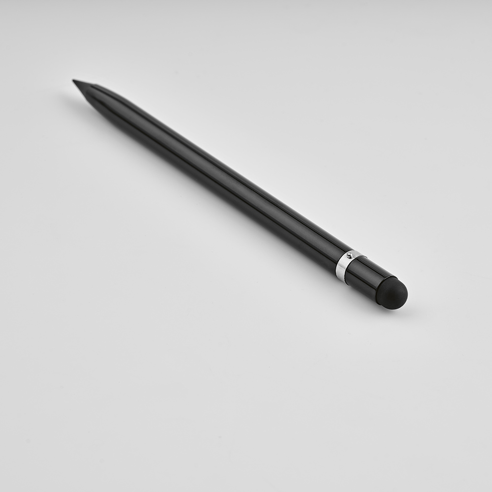 Penna senza inchiostro Voltaire con punta in grafite, realizzata in alluminio riciclato. Questa penna rivoluziona la scrittura grazie al dettaglio argento, alla gomma interna e alla punta touch. Presentata in una confezione singola nera in carta riciclata.