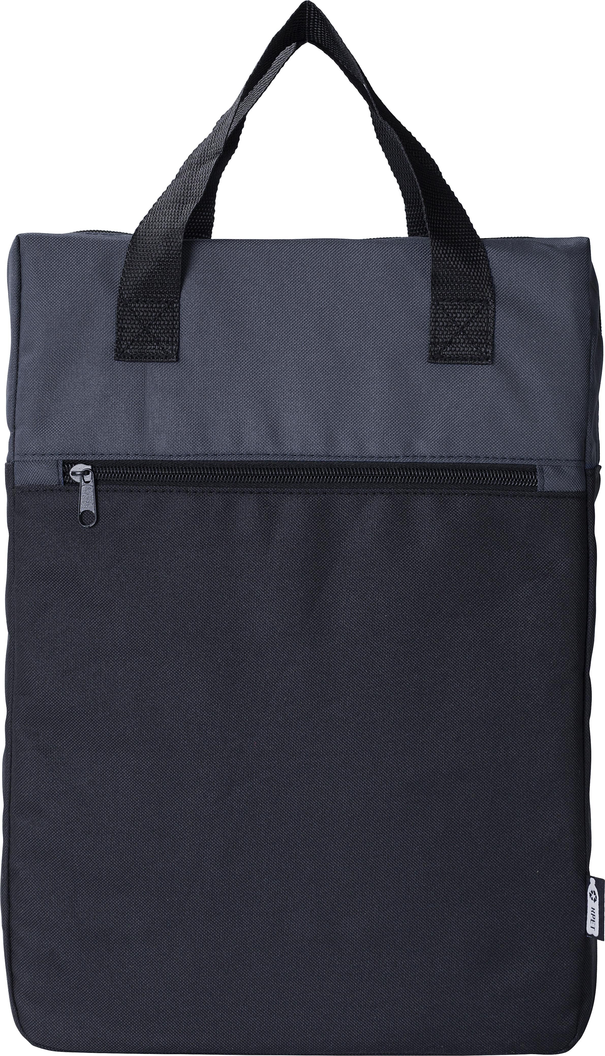Zaino in poliestere 600 D rPET, include ampio scomparto, tasca frontale con chiusura lampo, dettaglio in colore nella parte superiore, nero nella parte inferiore, maniglie per il trasporto sulla parte superiore