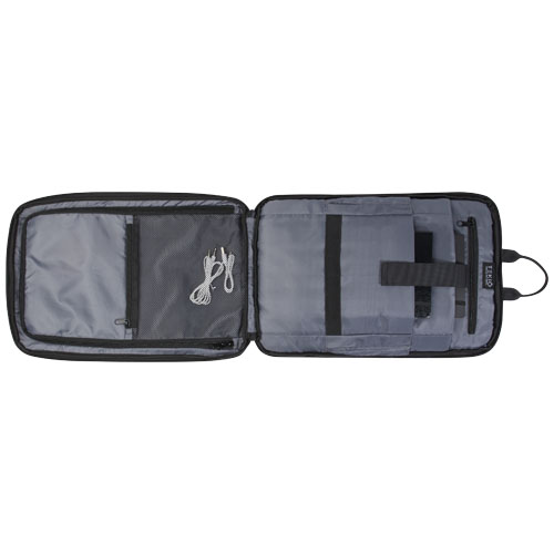 Realizzato in resistente poliestere riciclato 900D certificato GRS, lo zaino Rise ha tutto ciò che serve. Presenta una custodia imbottita per laptop adatta per un portatili da 15,6", una custodia extra per un piccolo notebook o tablet e tasche con zip per gli oggetti più piccoli. Inoltre, all'interno è presente una cinghia elastica per il posizionamento della borraccia. La parte posteriore dello zaino presenta una comoda cinghia elastica, per agganciarlo facilmente a un trolley.